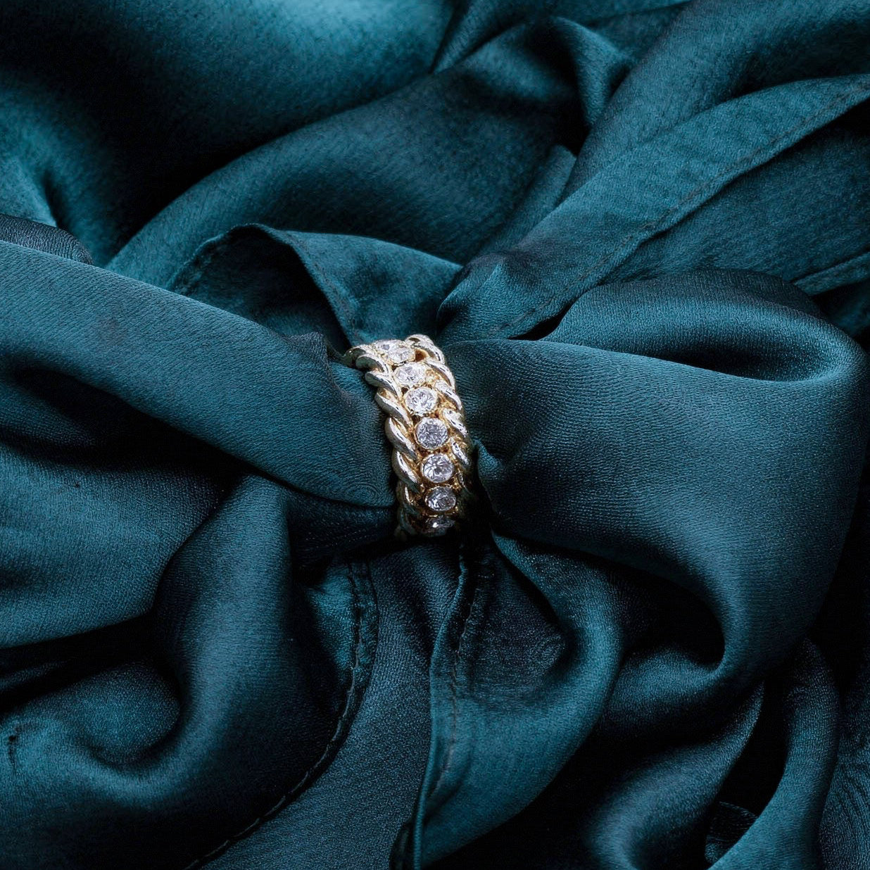 Anello con doppia fascia intrecciata e cristalli. Struttura elaborata che avvolge il dito. Brilla su più livelli.