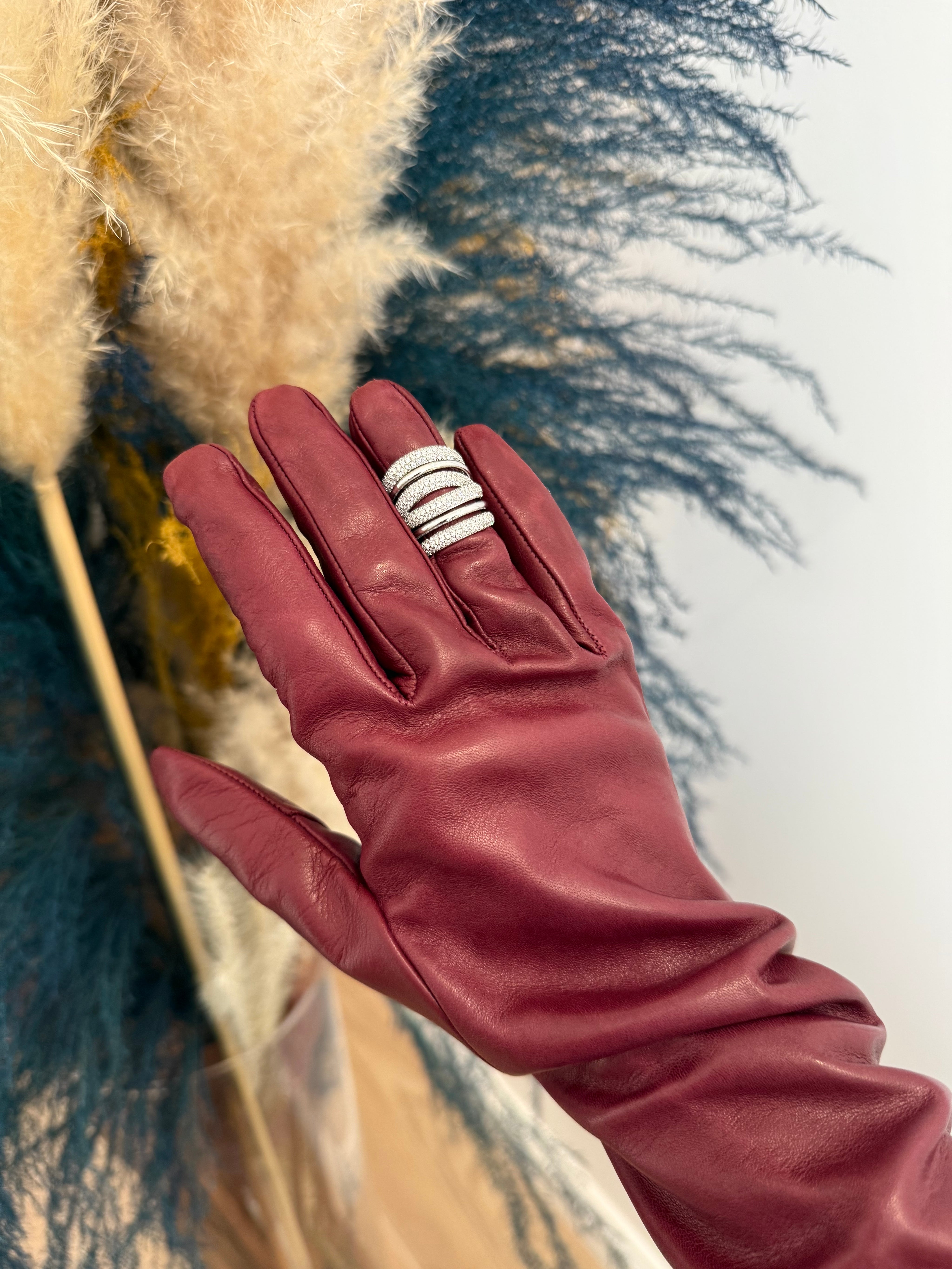 anello a fascia larga molto voluminoso è composto da piu fasce ondulate e parallele che si intrecciano o si sovrappongono leggermente.Le fasce alternate sono ricoperte di strass e creano un effetto scintillante molto evidente.