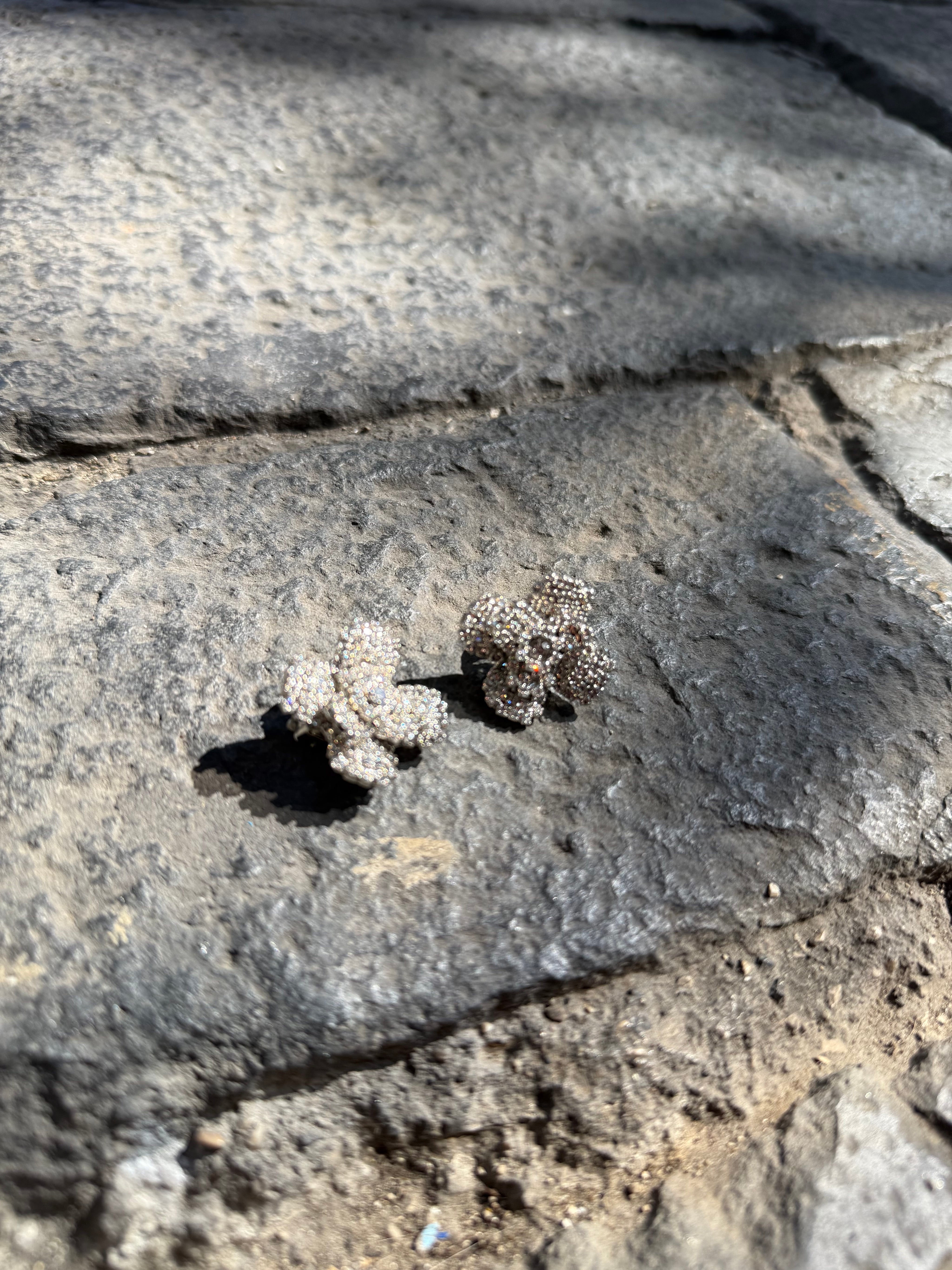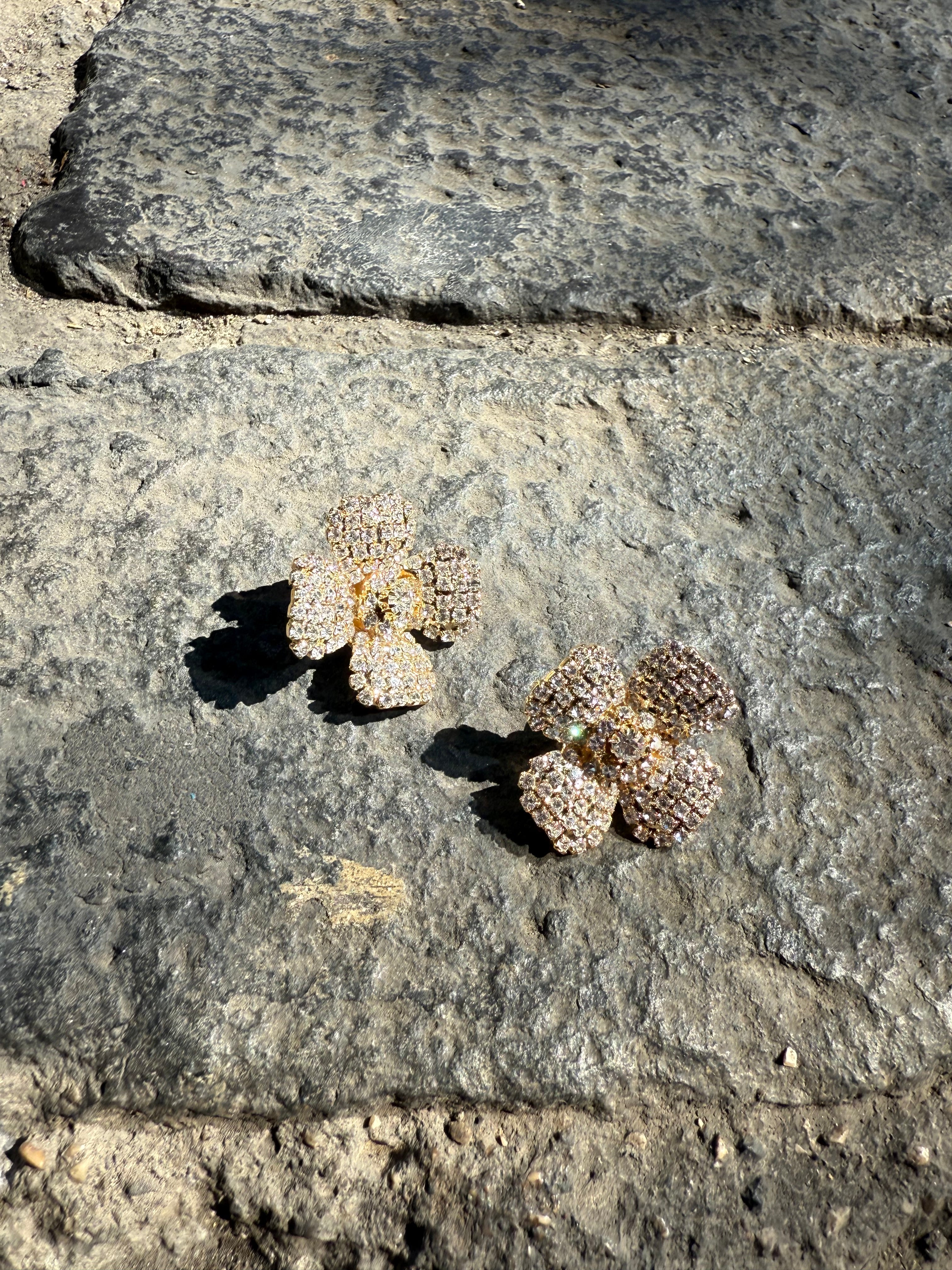 Eleganti orecchini a forma di quadrifoglio, completamente ricoperti da luminosi cristalli/pietre brillanti che donano un effetto scintillante e raffinato. La forma a quattro petali, simbolo di fortuna e armonia, li rende un accessorio distintivo e senza tempo. Perfetti per aggiungere un tocco di luce a look eleganti o da cerimonia.