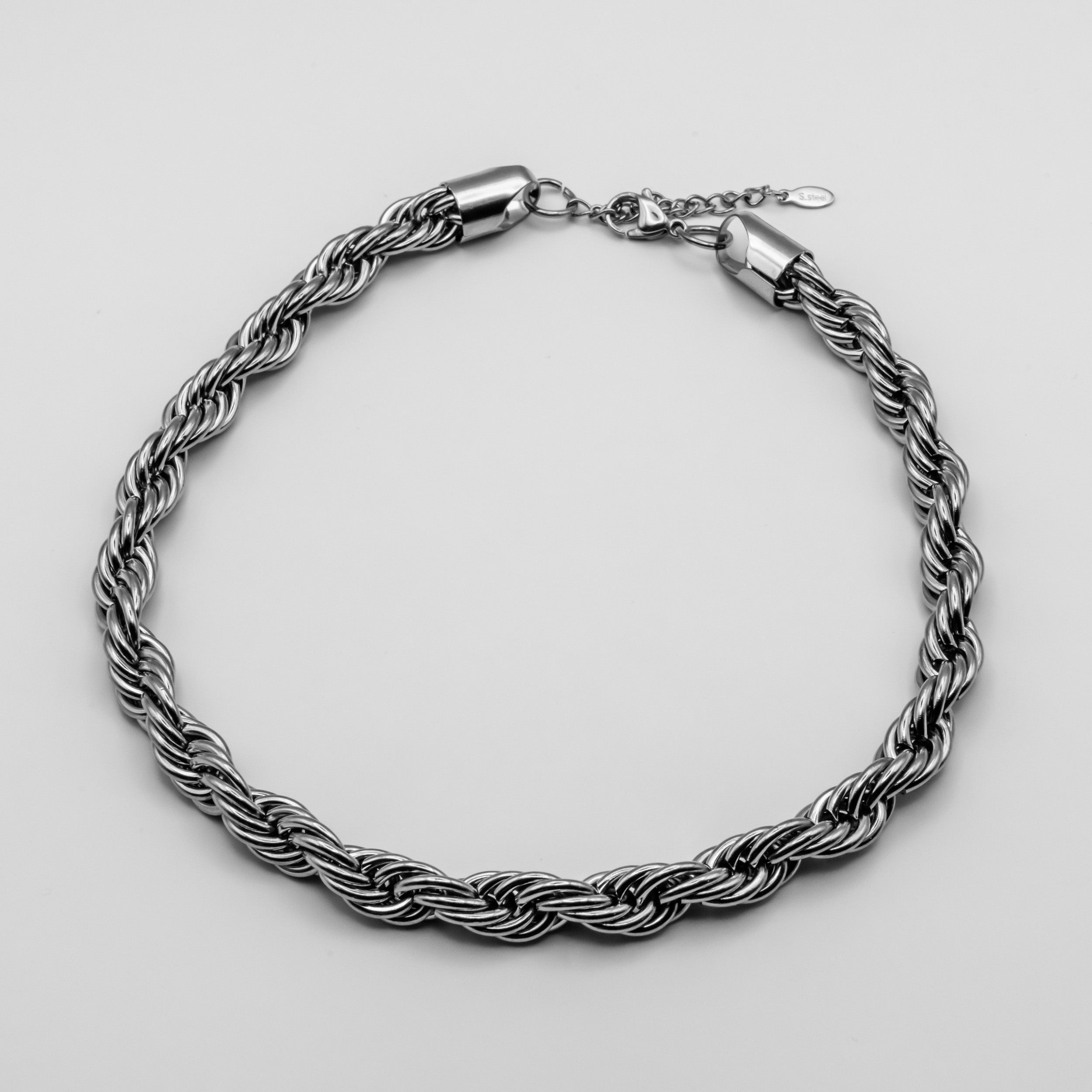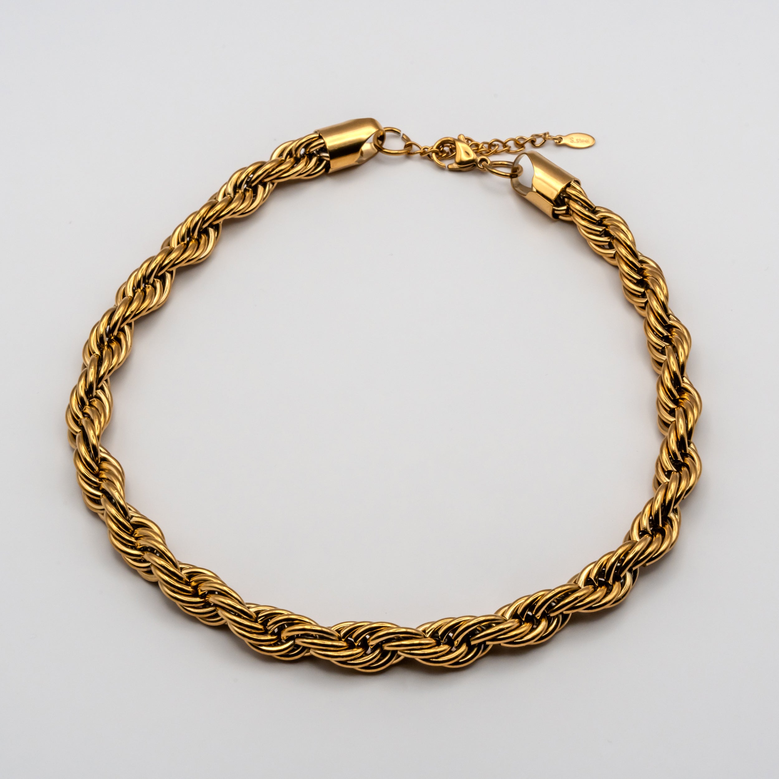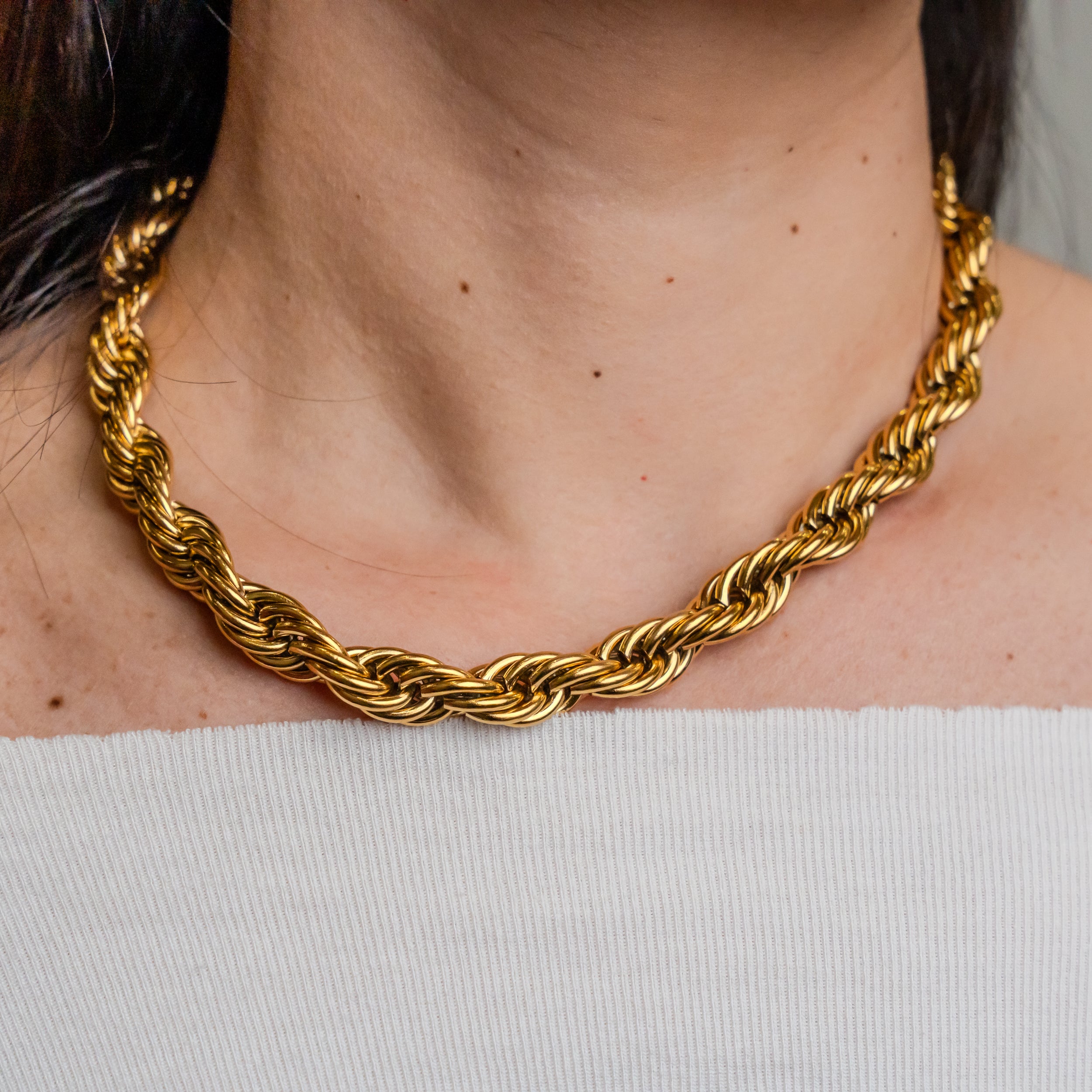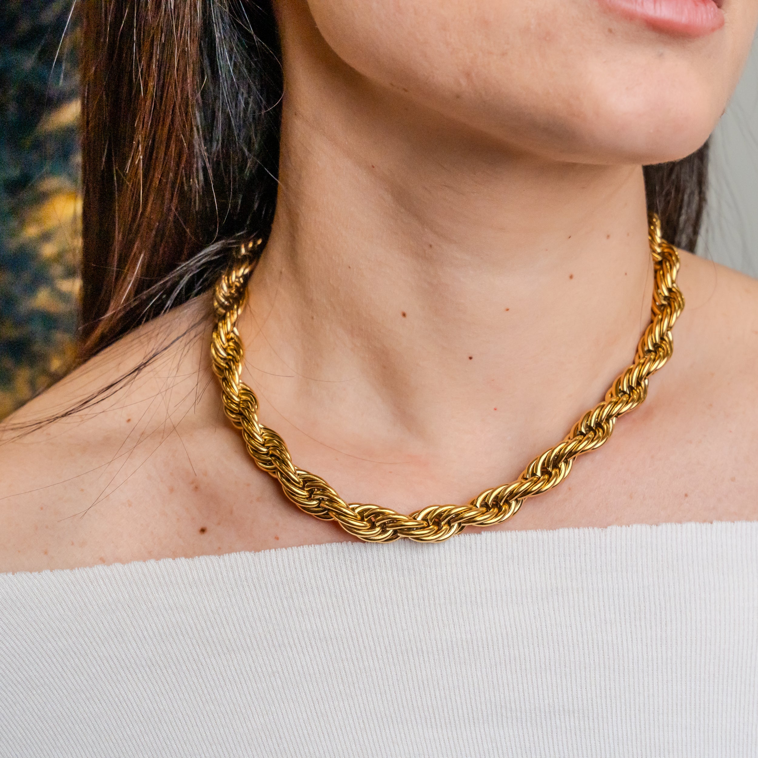 Collana girocollo statement a catena spessa lavorazione corda/torcione, placcatura oro 18k o argento.