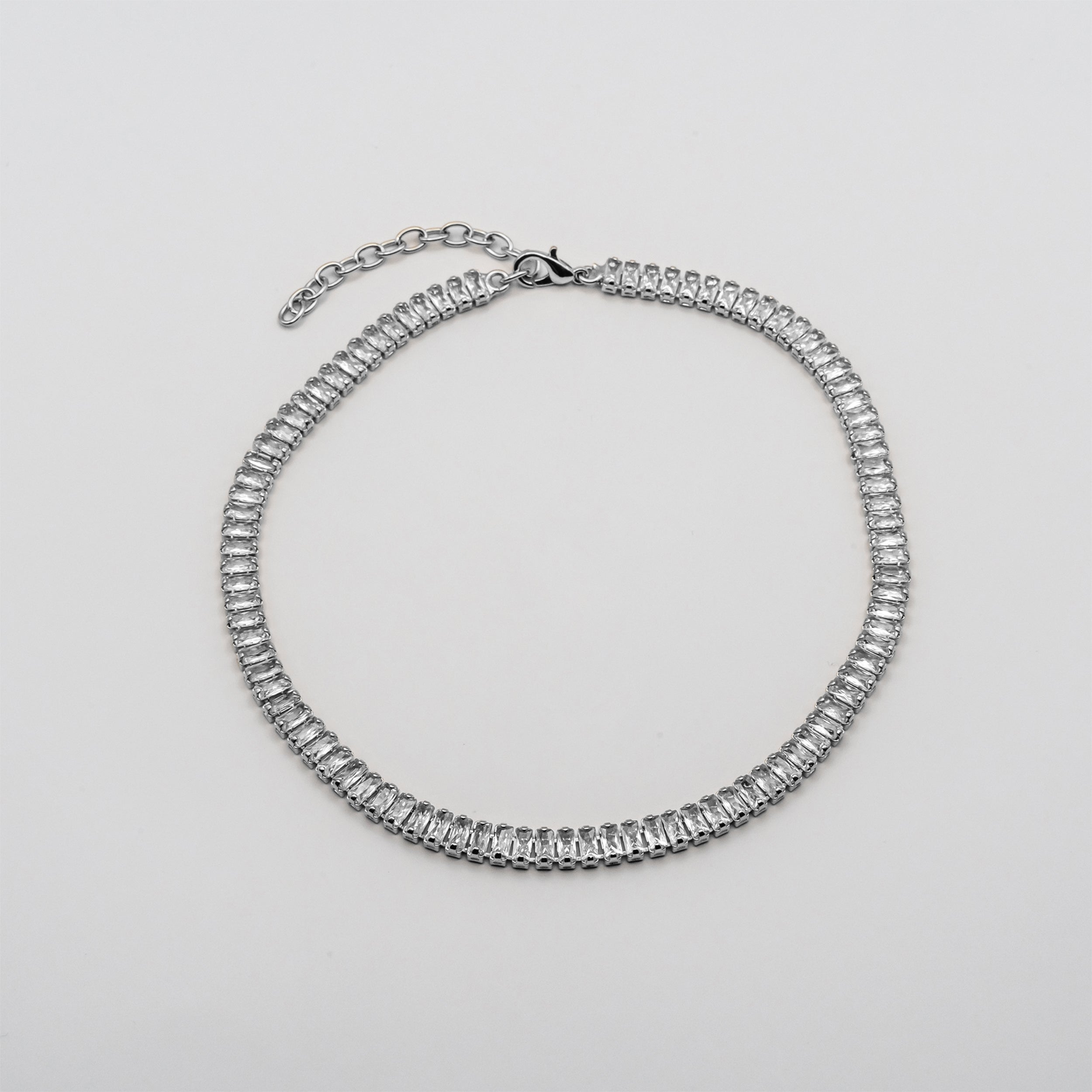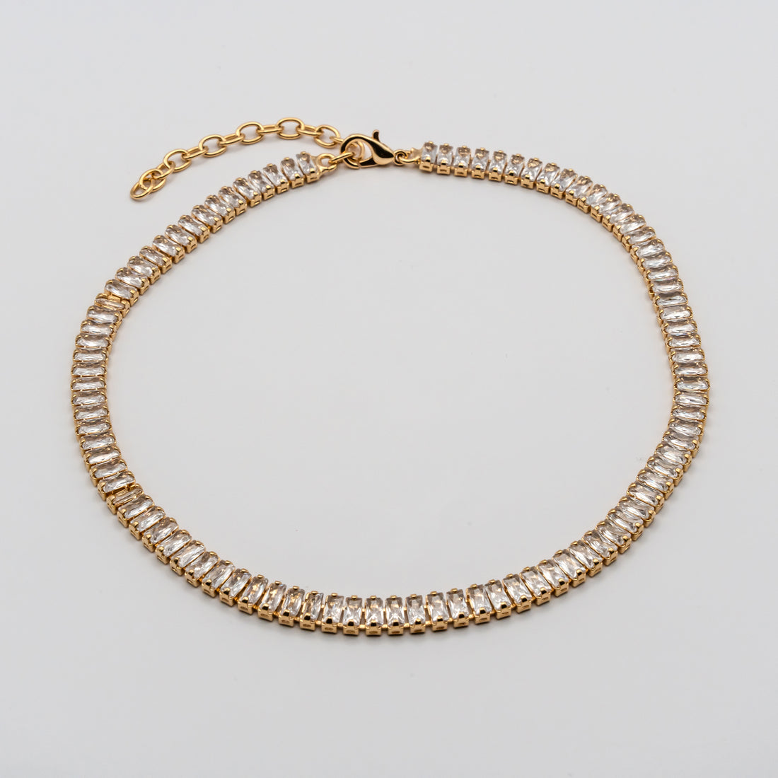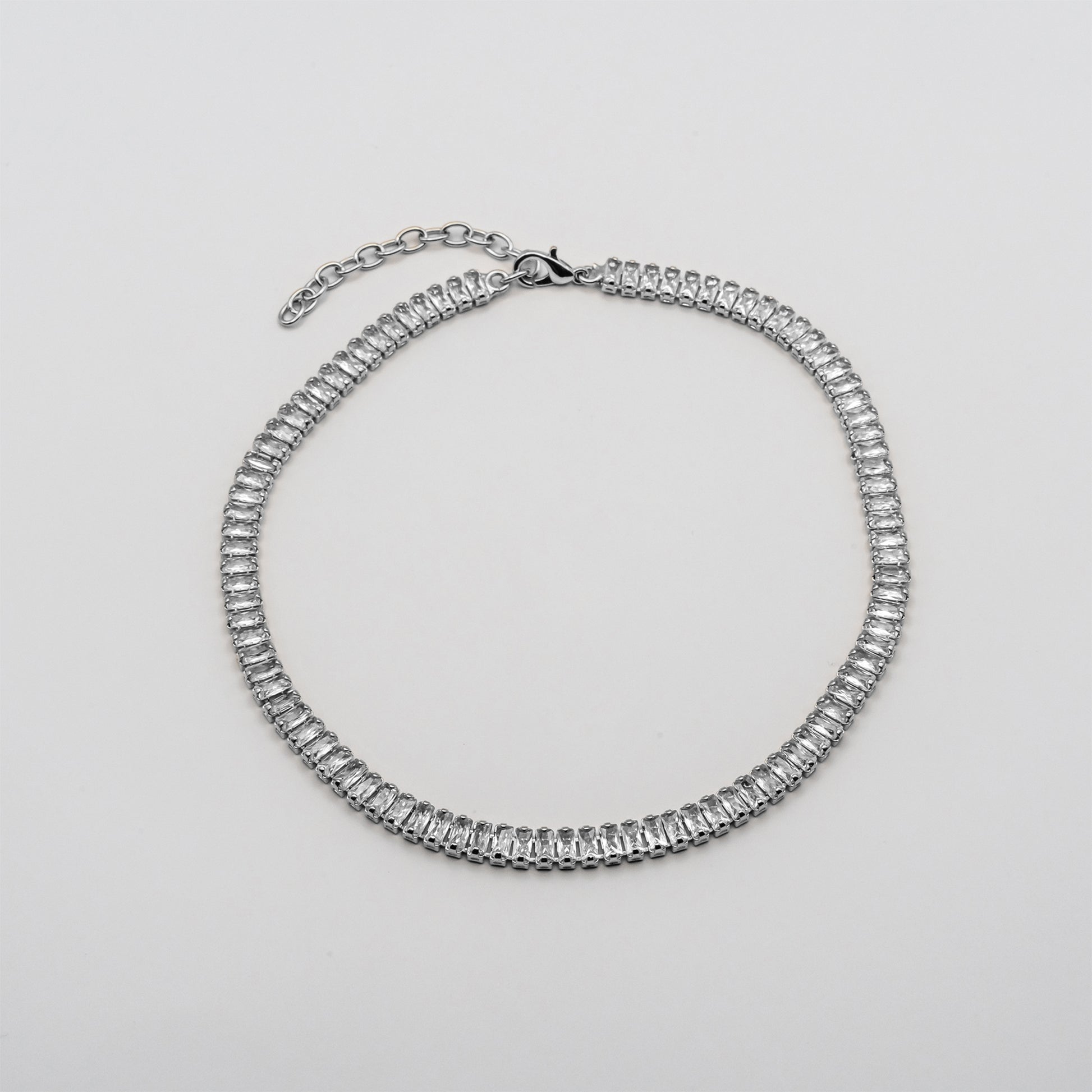 Collana choker tennis con singola fila di strass luminosi taglio baguette, placcatura oro 18k o argento.