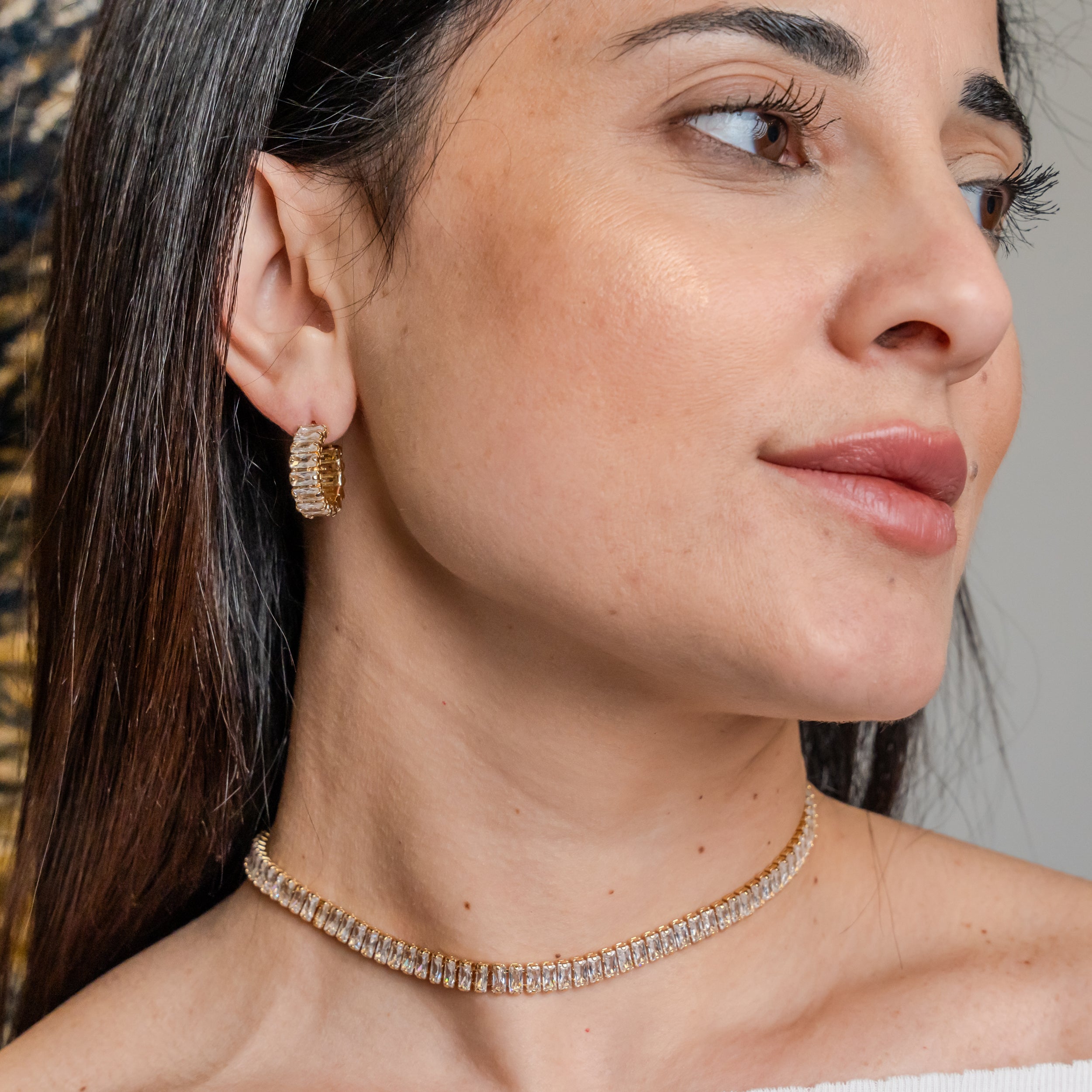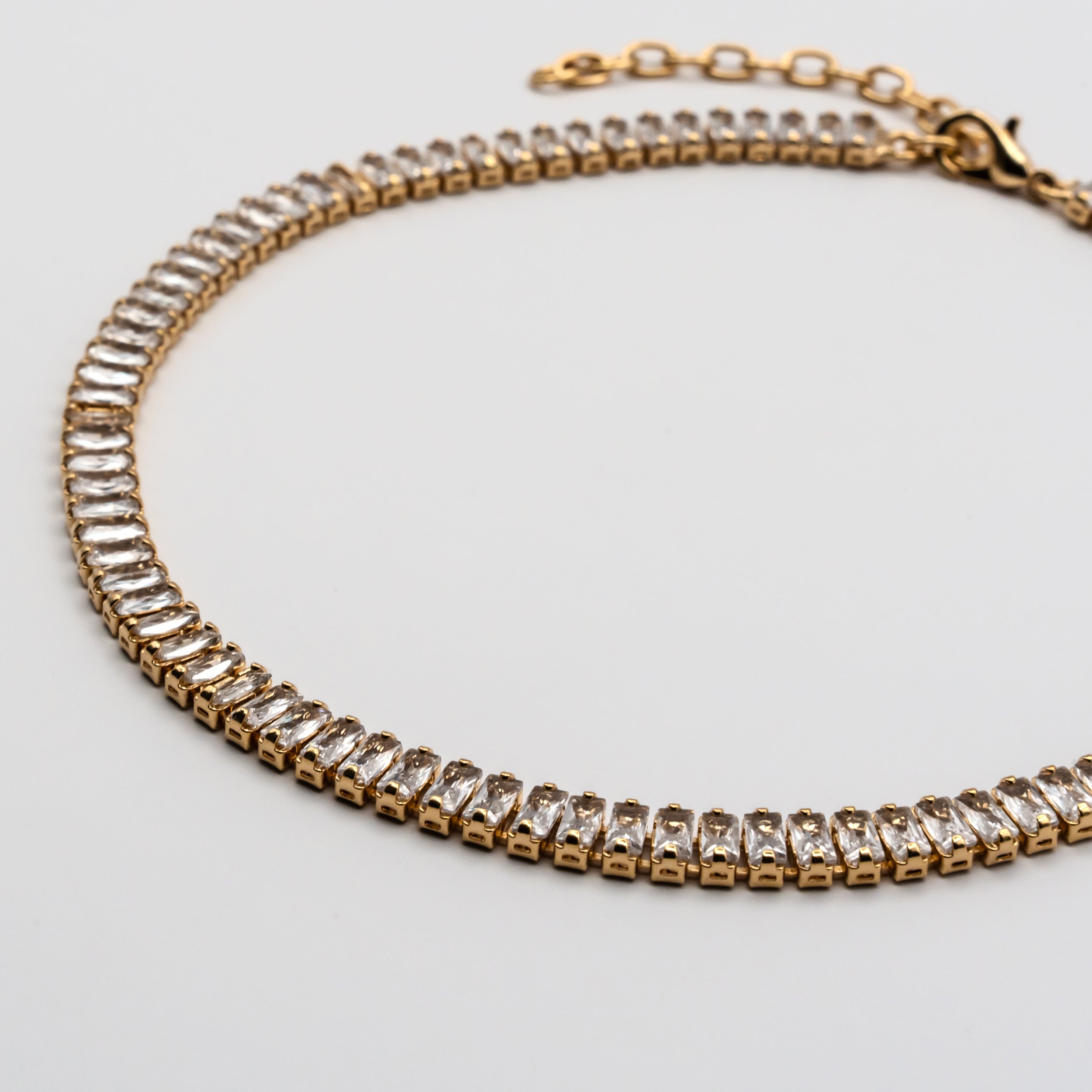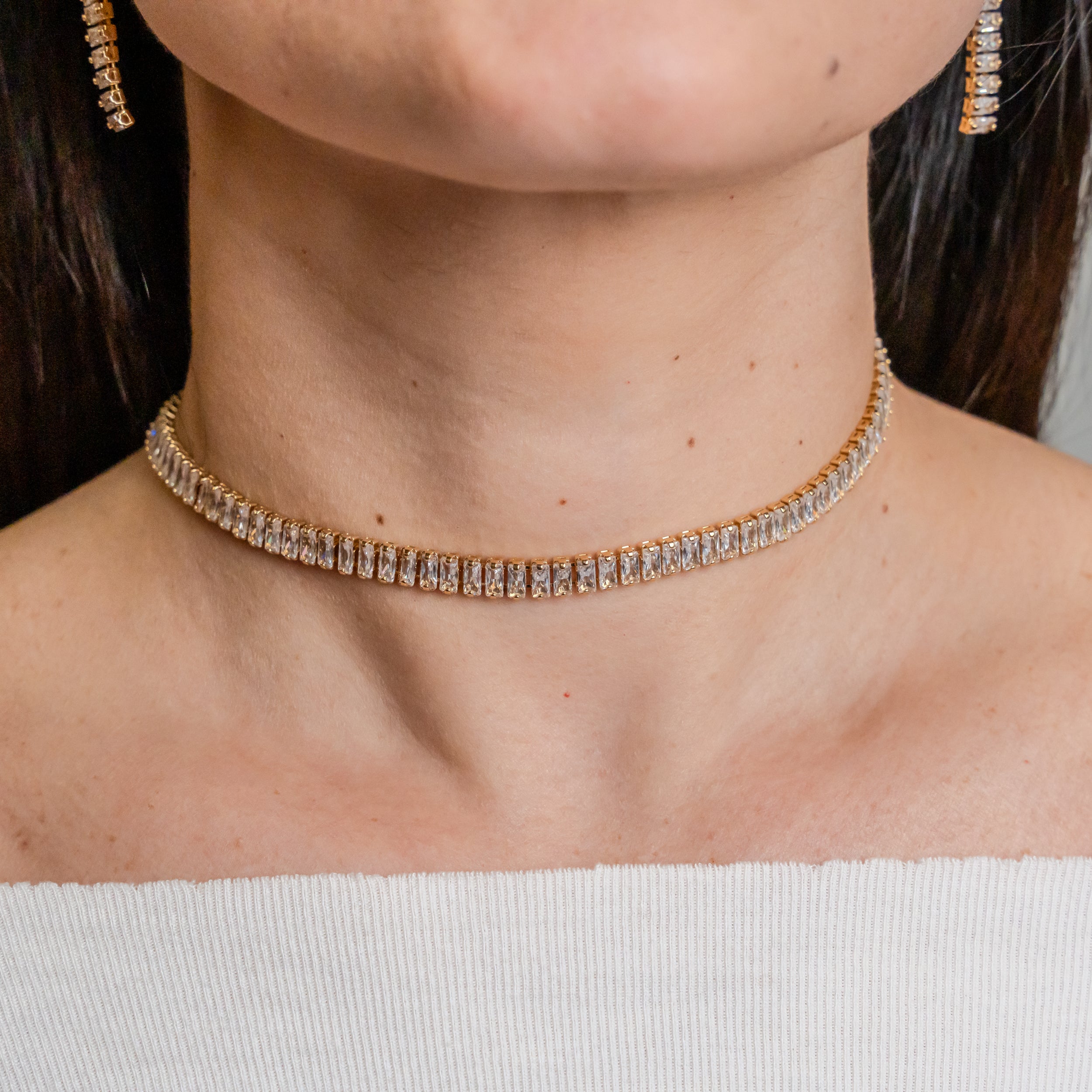 Collana choker tennis con singola fila di strass luminosi taglio baguette, placcatura oro 18k o argento.