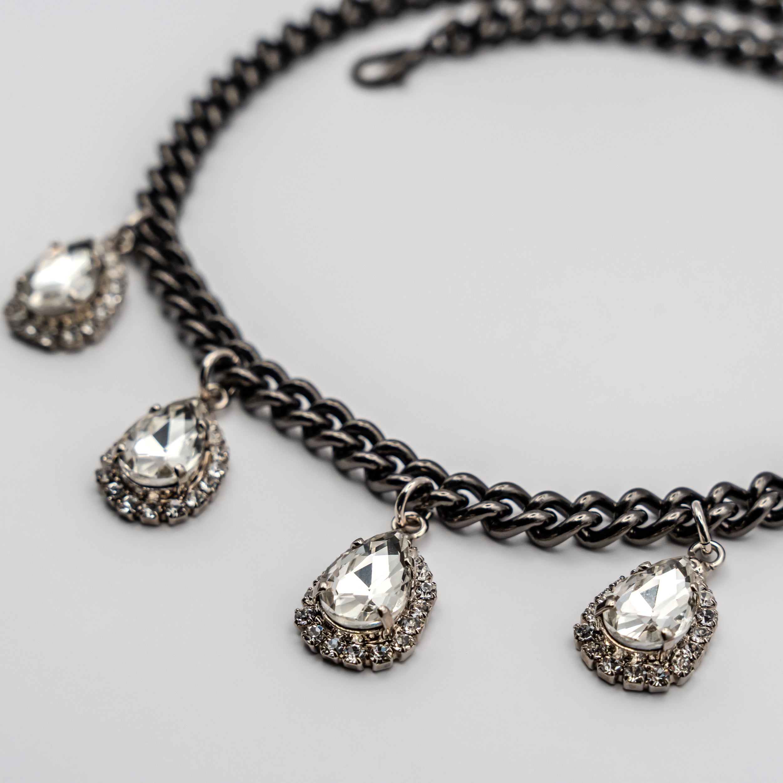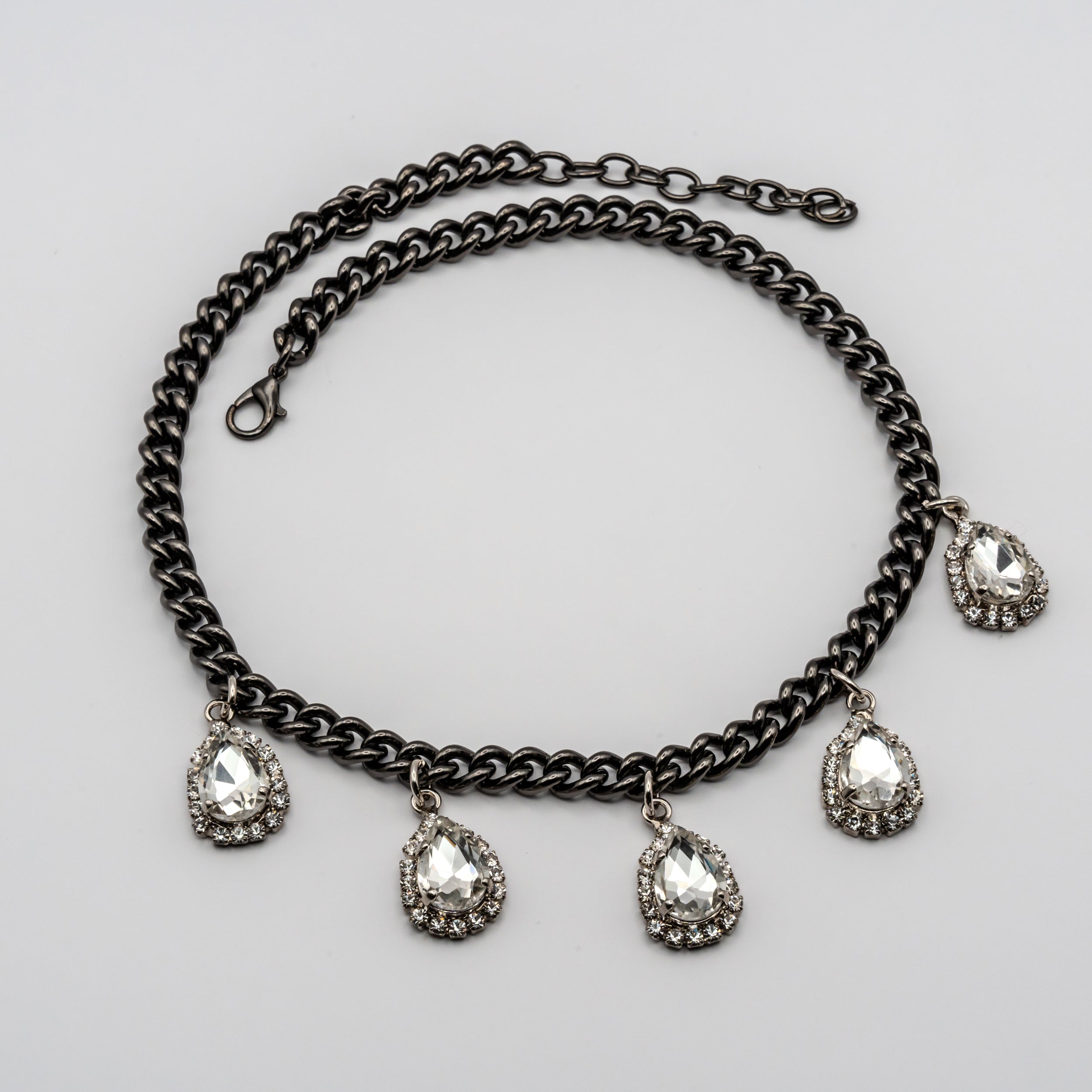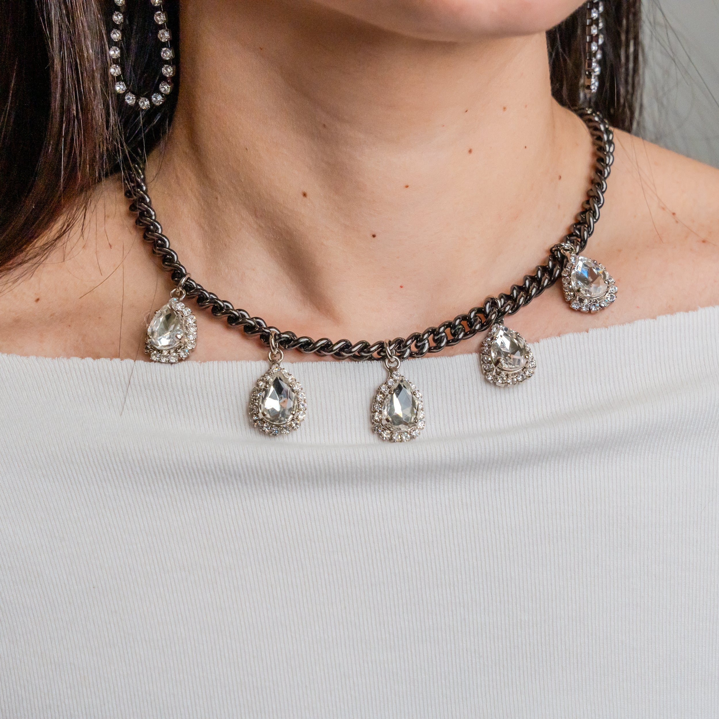 Collana choker a catena con pendenti multipli a goccia in strass luminosi, finitura nero rutenio.