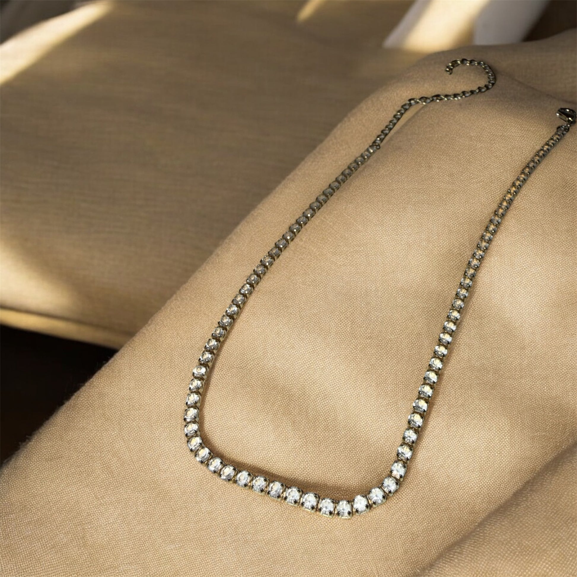 Una collana tennis costruita su una fila continua di strass che cresce gradualmente verso il centro, i cristalli più piccoli partono dalla chiusura e diventano più grandi man mano che scendono.
