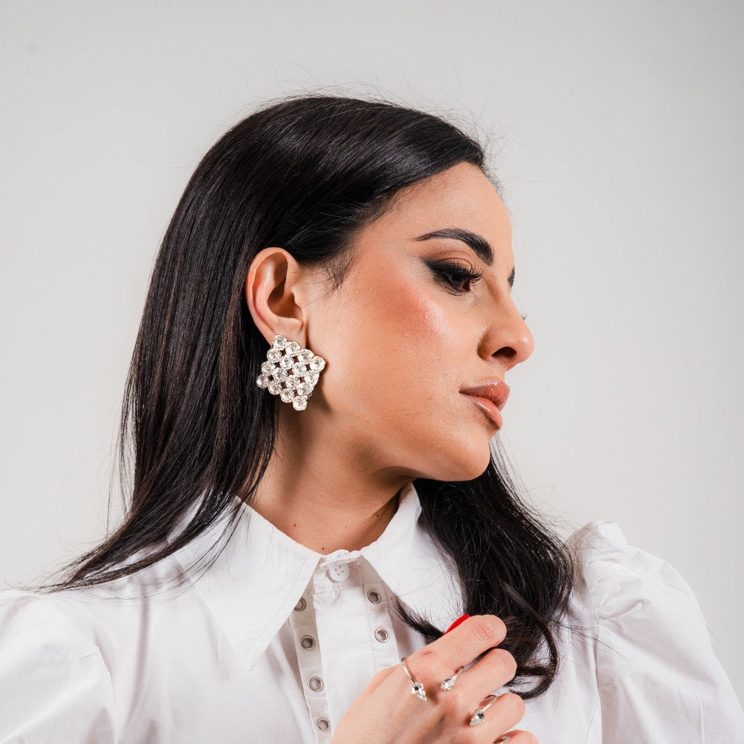 Orecchino strutturato a griglia di navette. Brilla da ogni angolazione, copre buona parte del lobo.