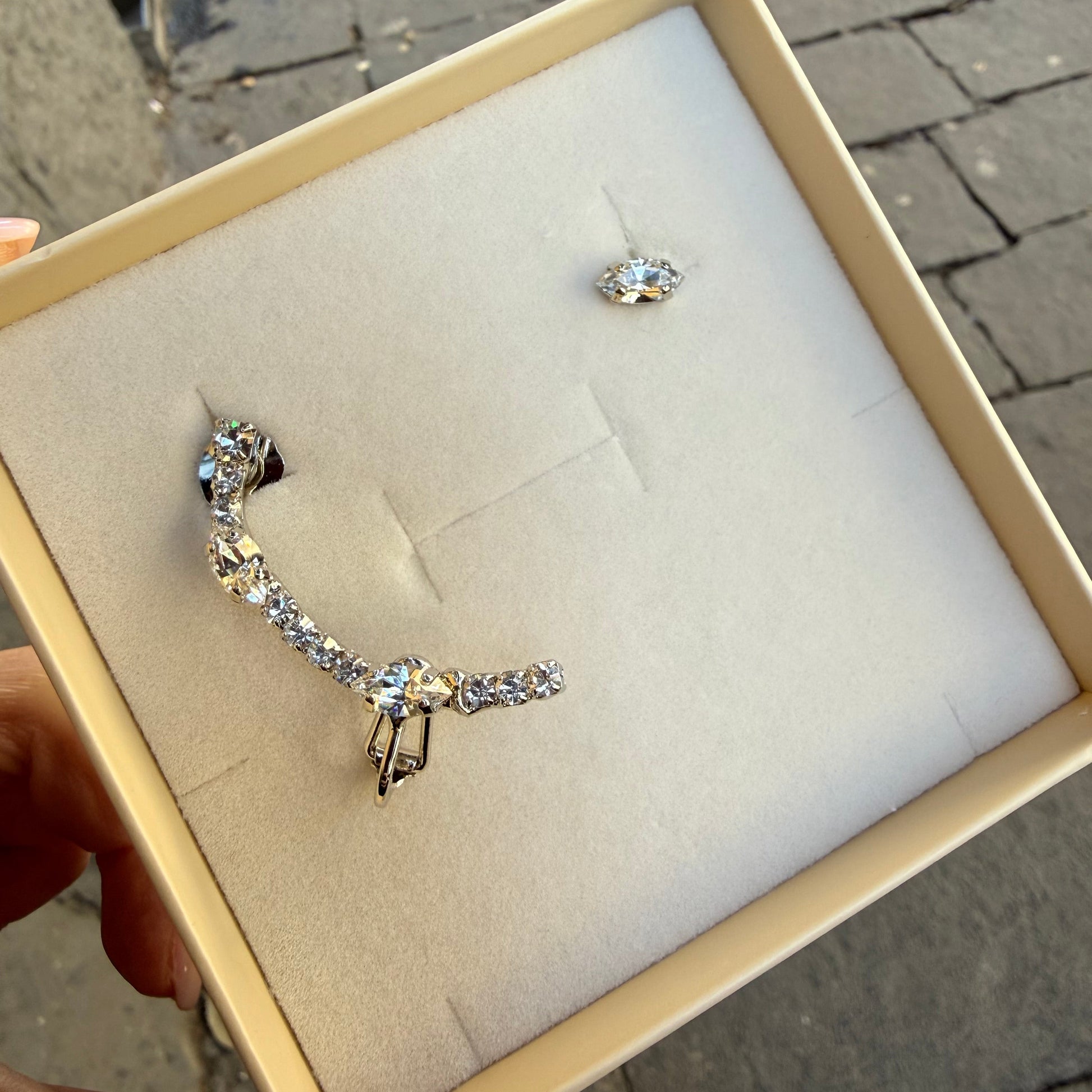 Insieme all'ear cuff c'è un orecchino a perno più piccolo con una singola pietra a goccia, pensato per l'altro orecchio.