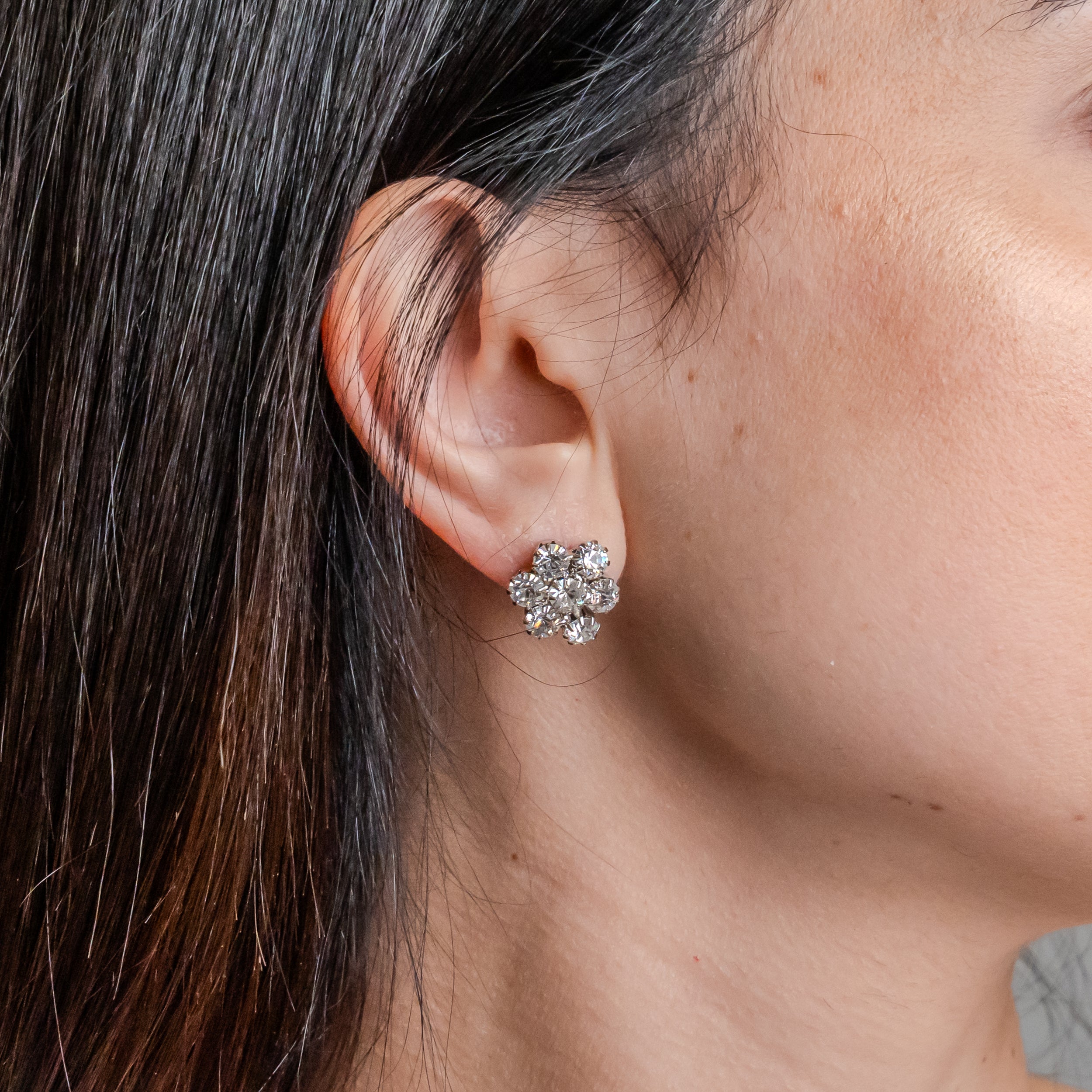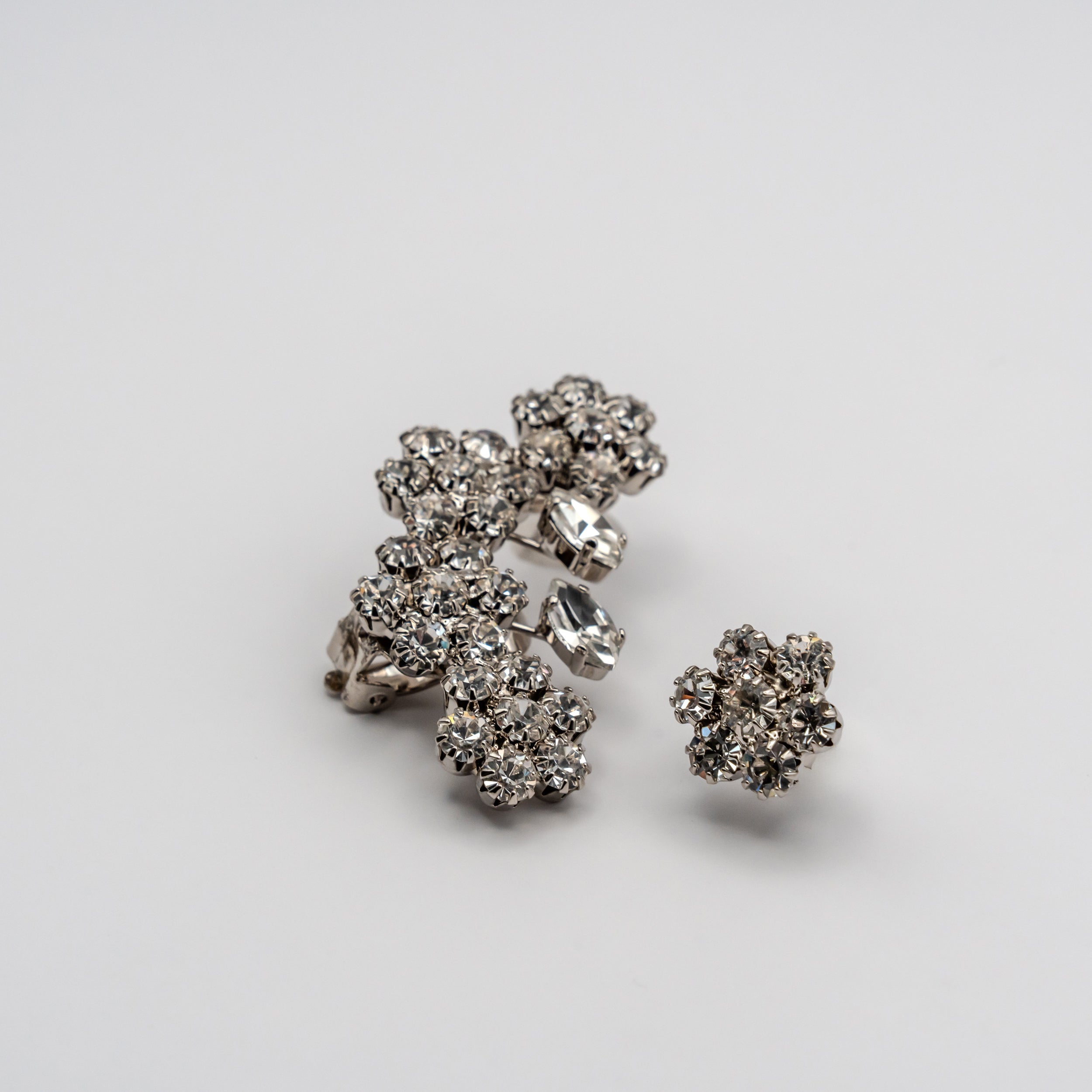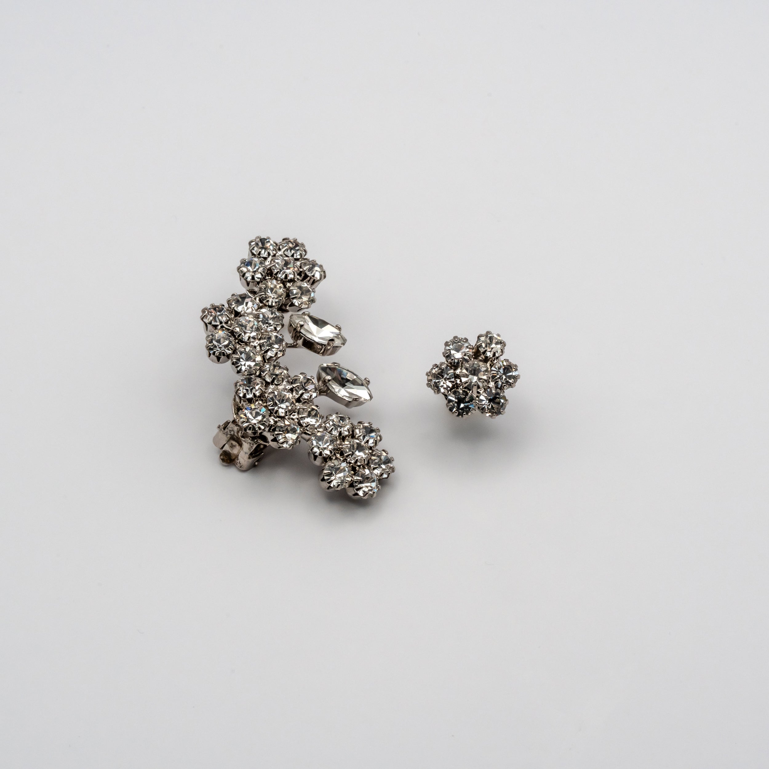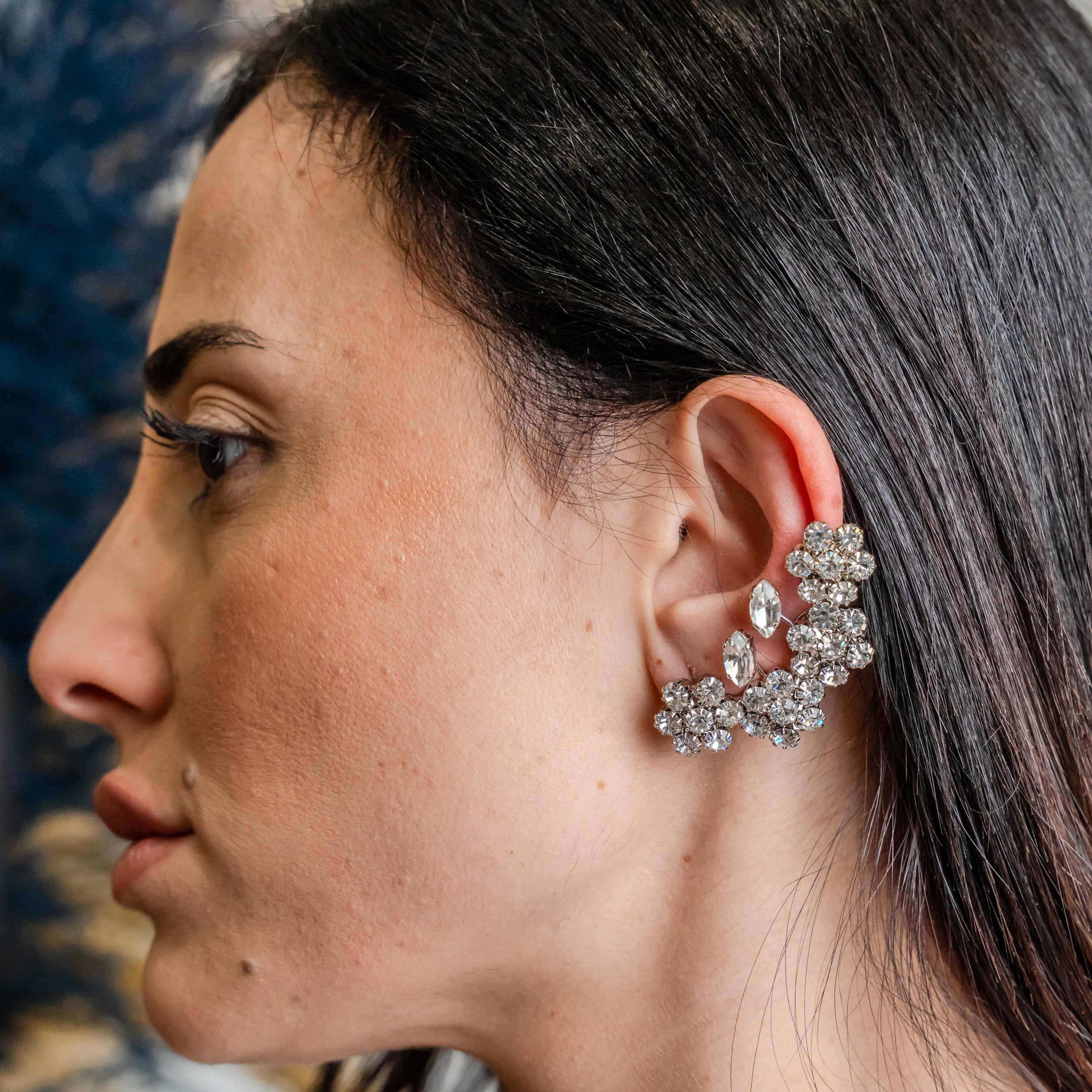 Set asimmetrico: ear cuff con cluster floreali e orecchino a lobo con strass taglio brillante e marquise, finitura argento.