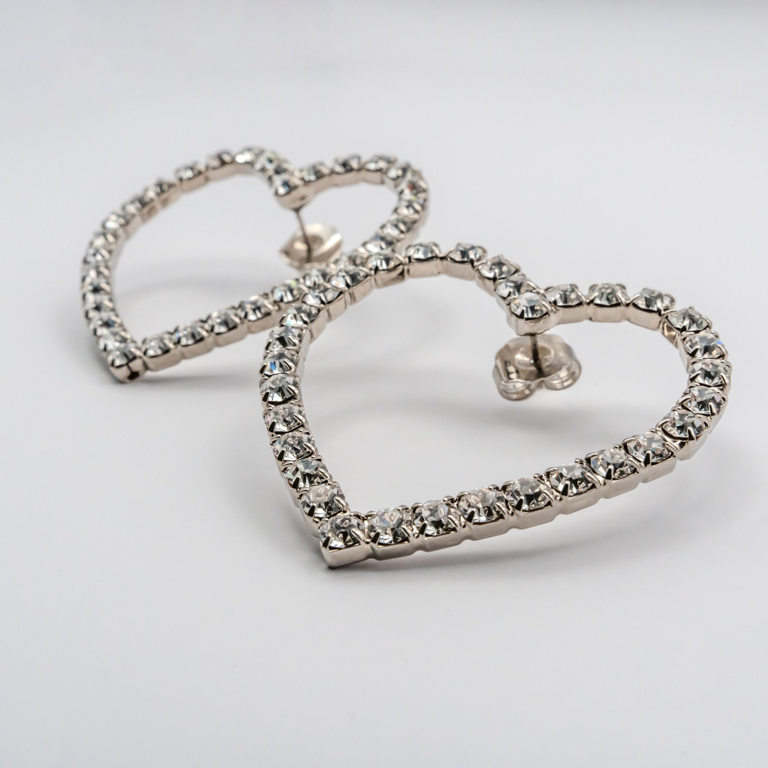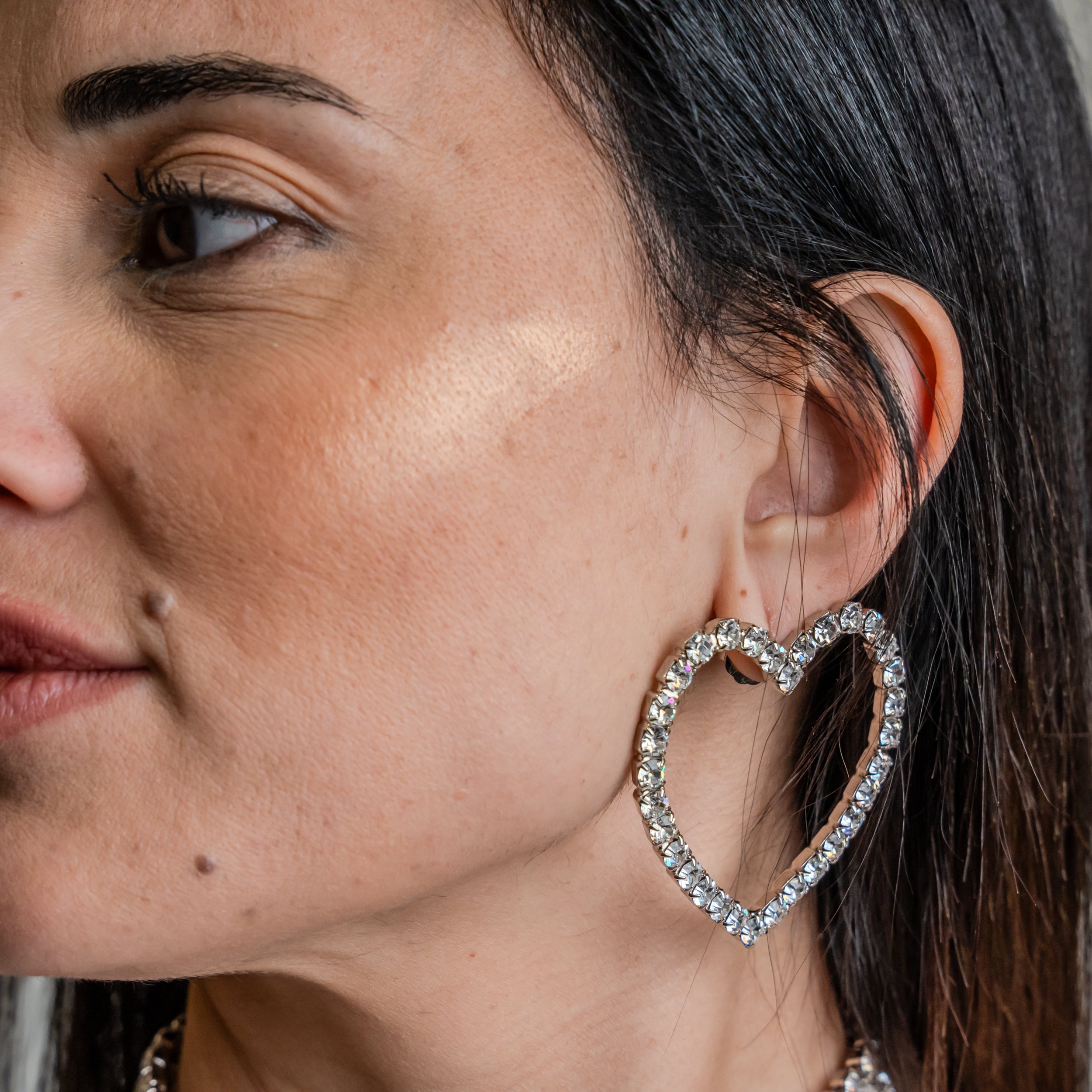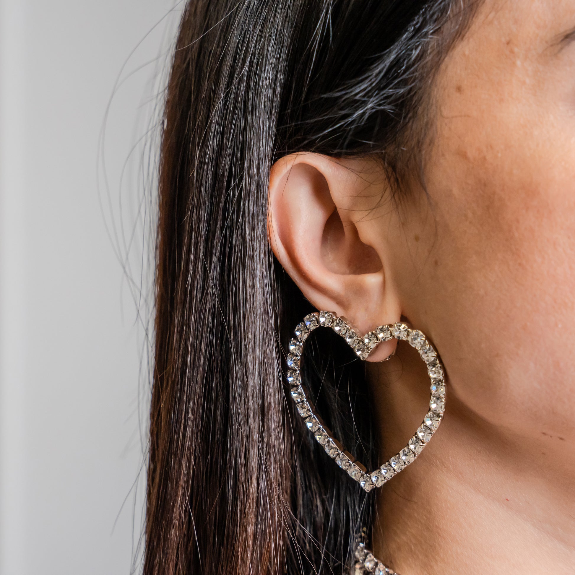 Orecchini statement a cerchio a forma di cuore aperto interamente ricoperti di strass, finitura argento.