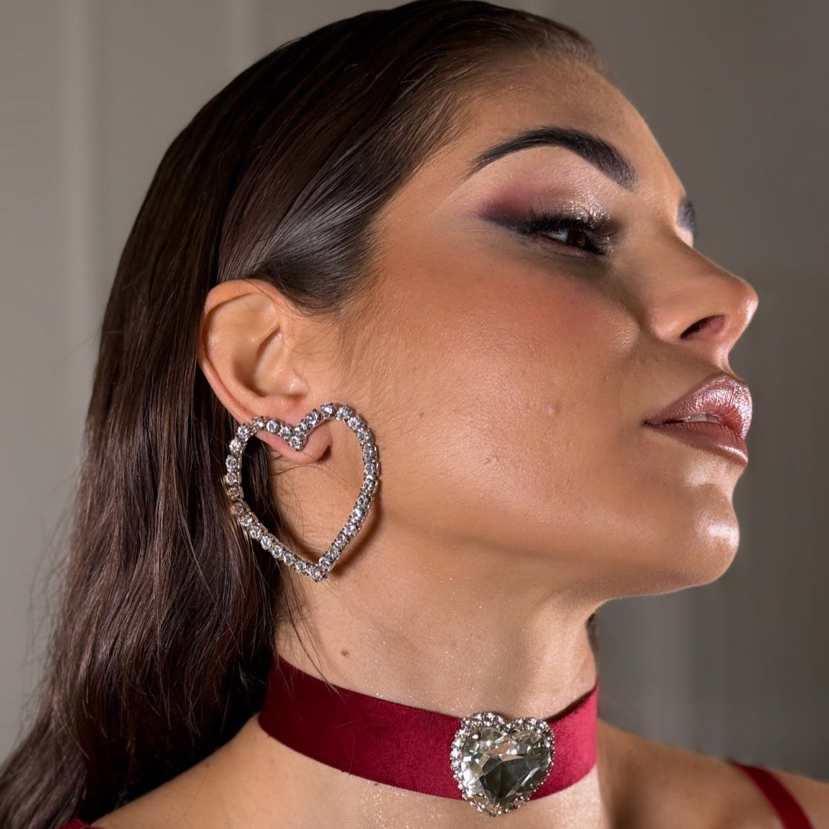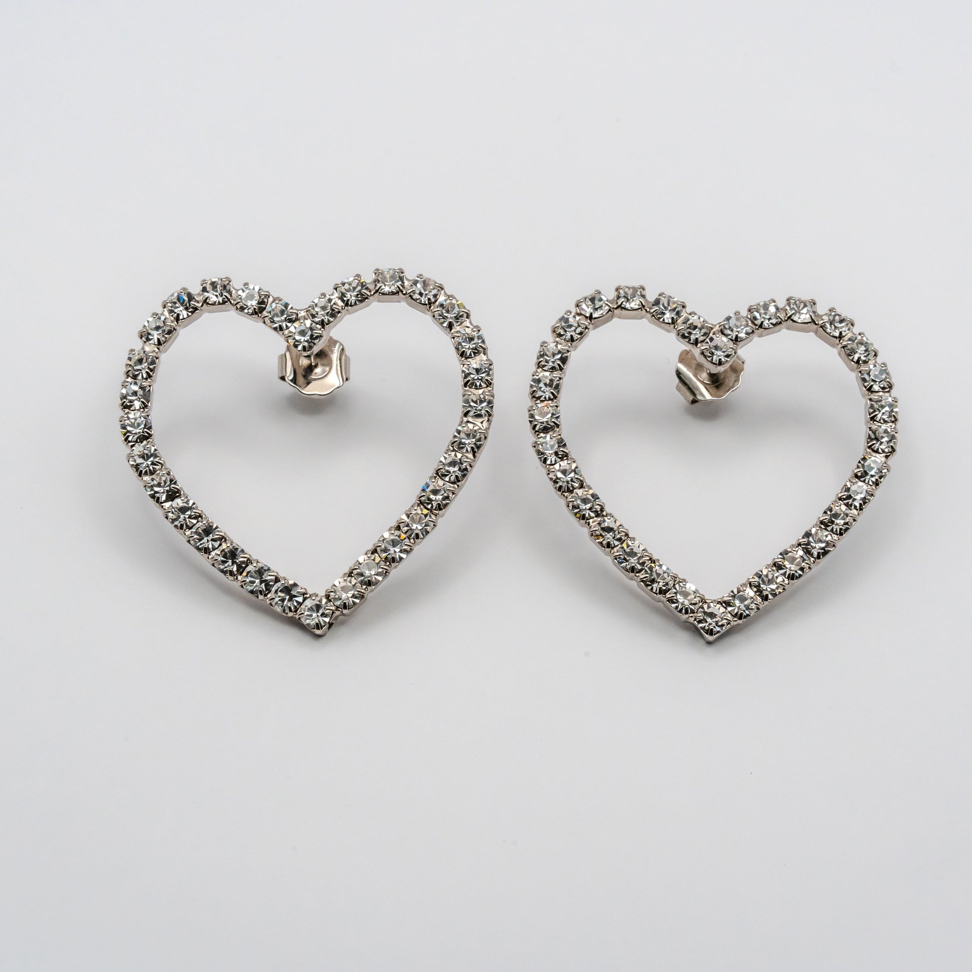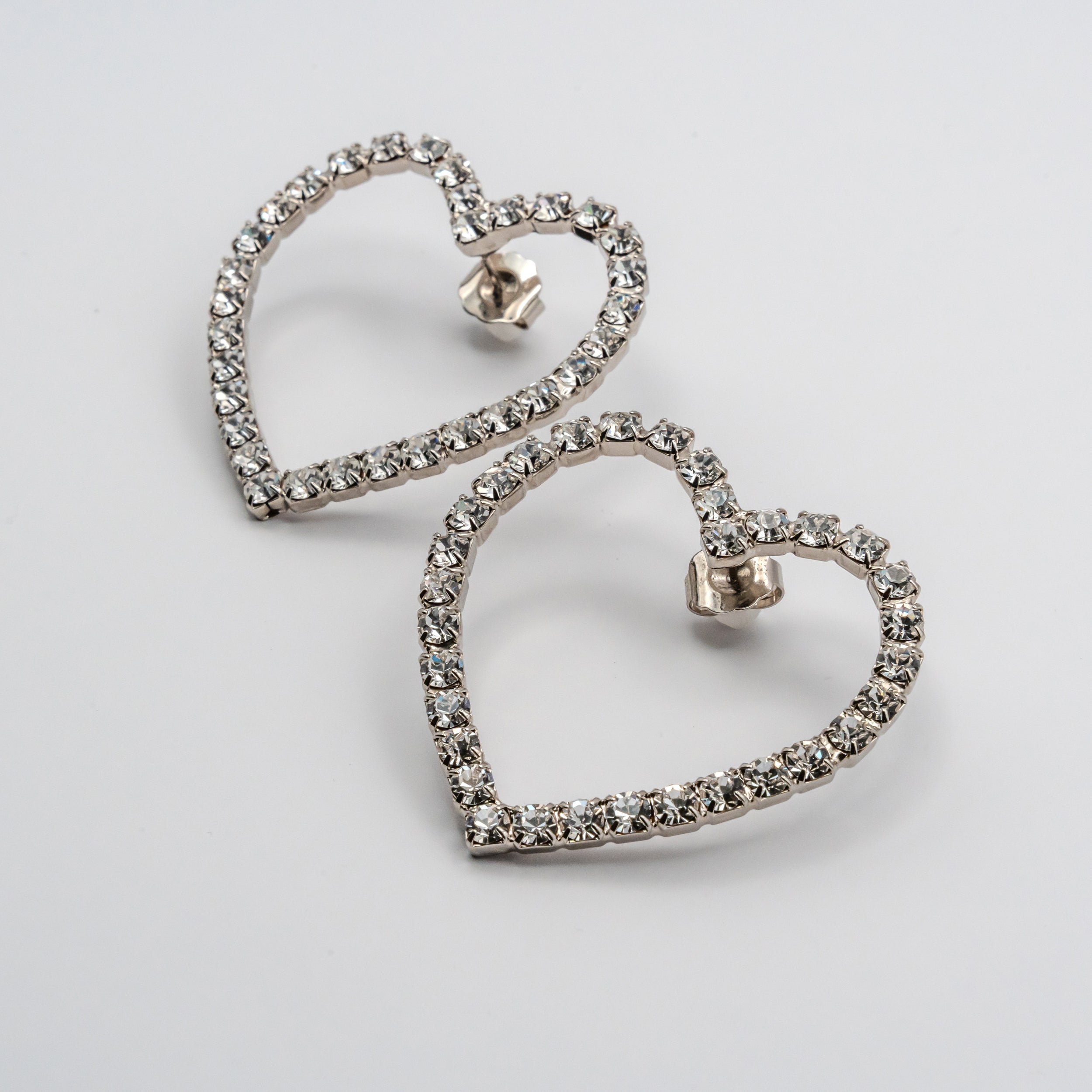 Orecchini statement a cerchio a forma di cuore aperto interamente ricoperti di strass, finitura argento.
