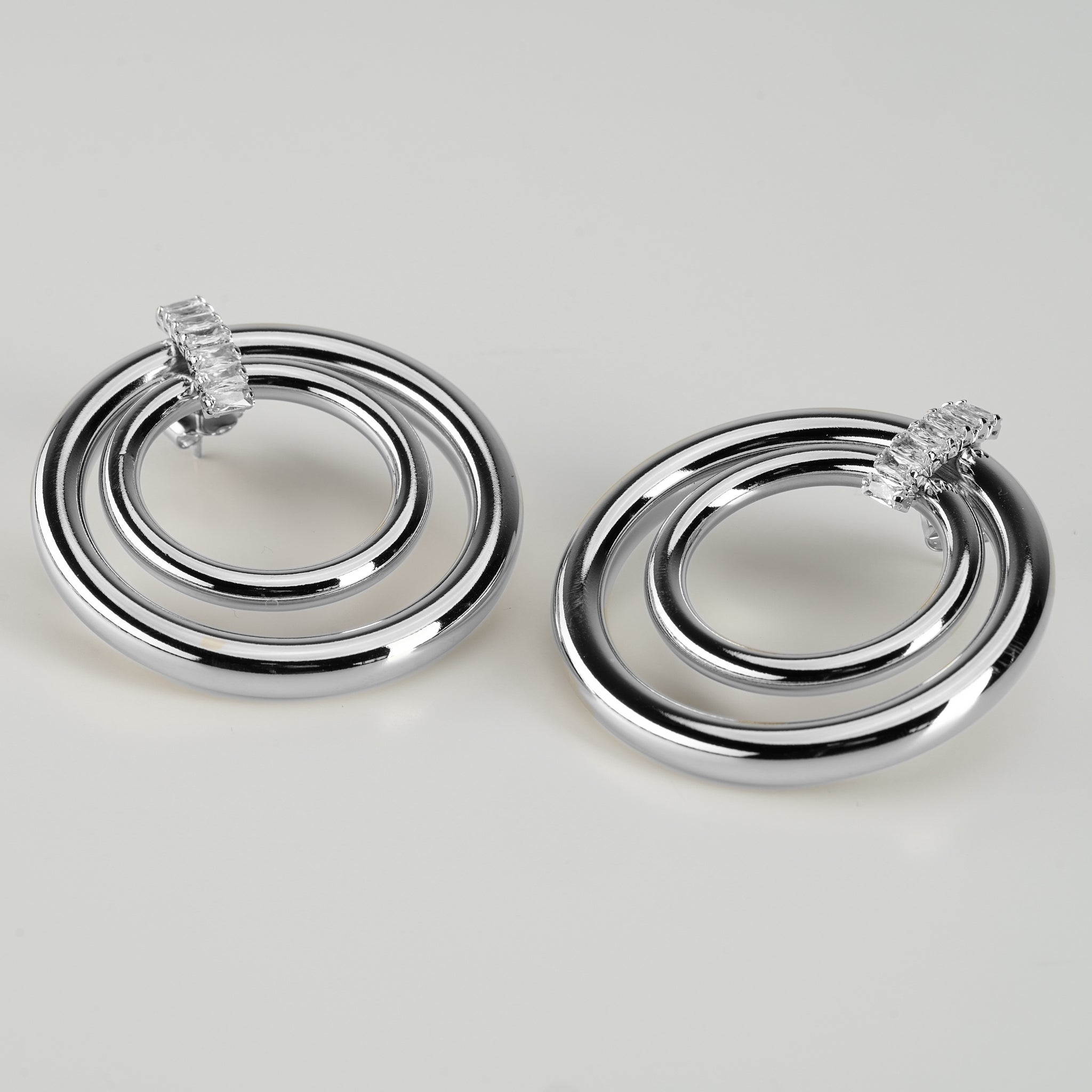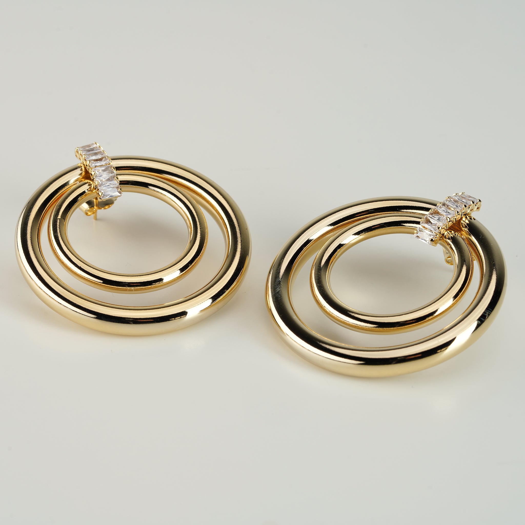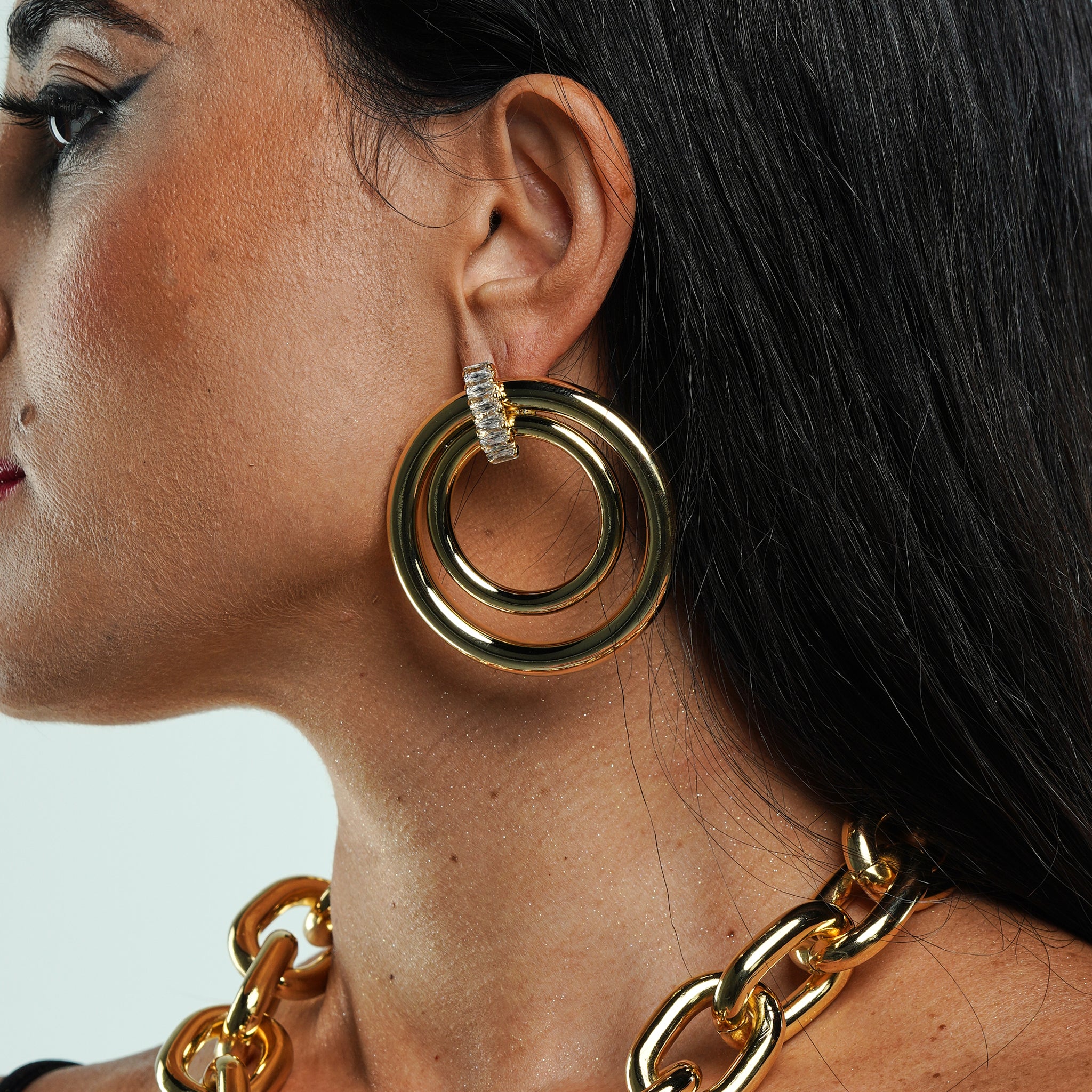 Orecchini statement a cerchio doppio con barra luminosa taglio baguette al lobo, disponibili placcati oro 18k o argento.
