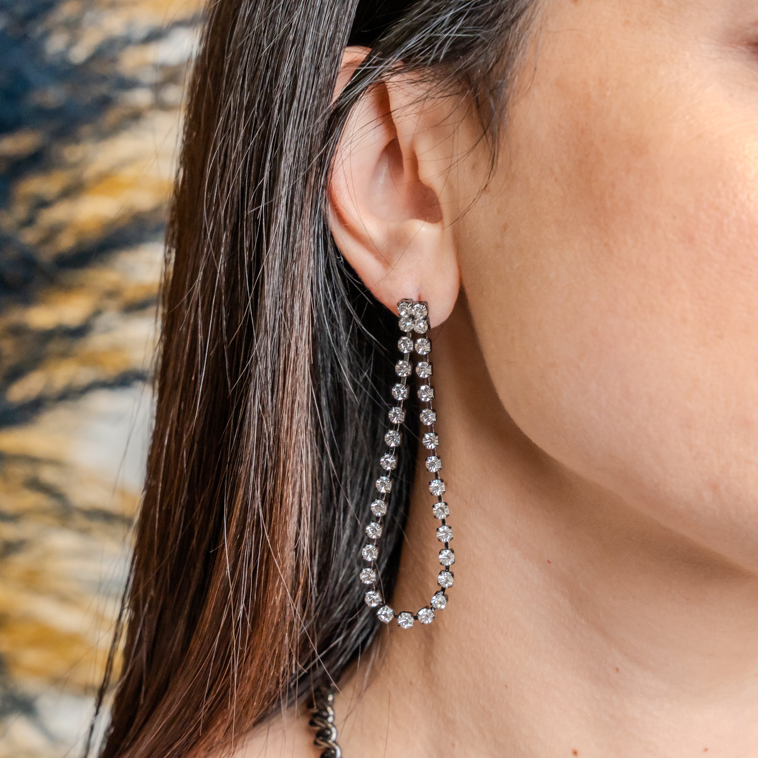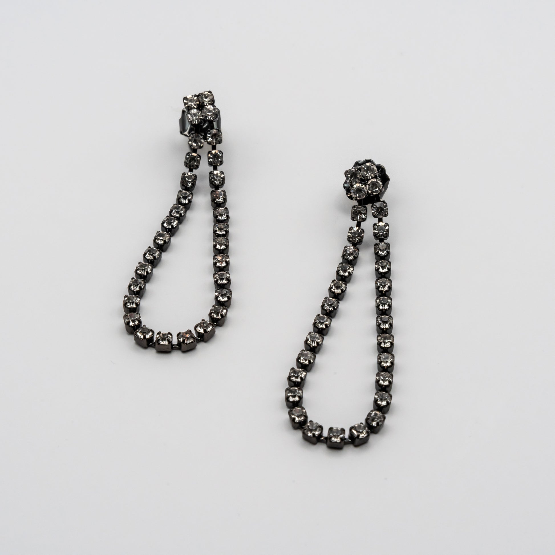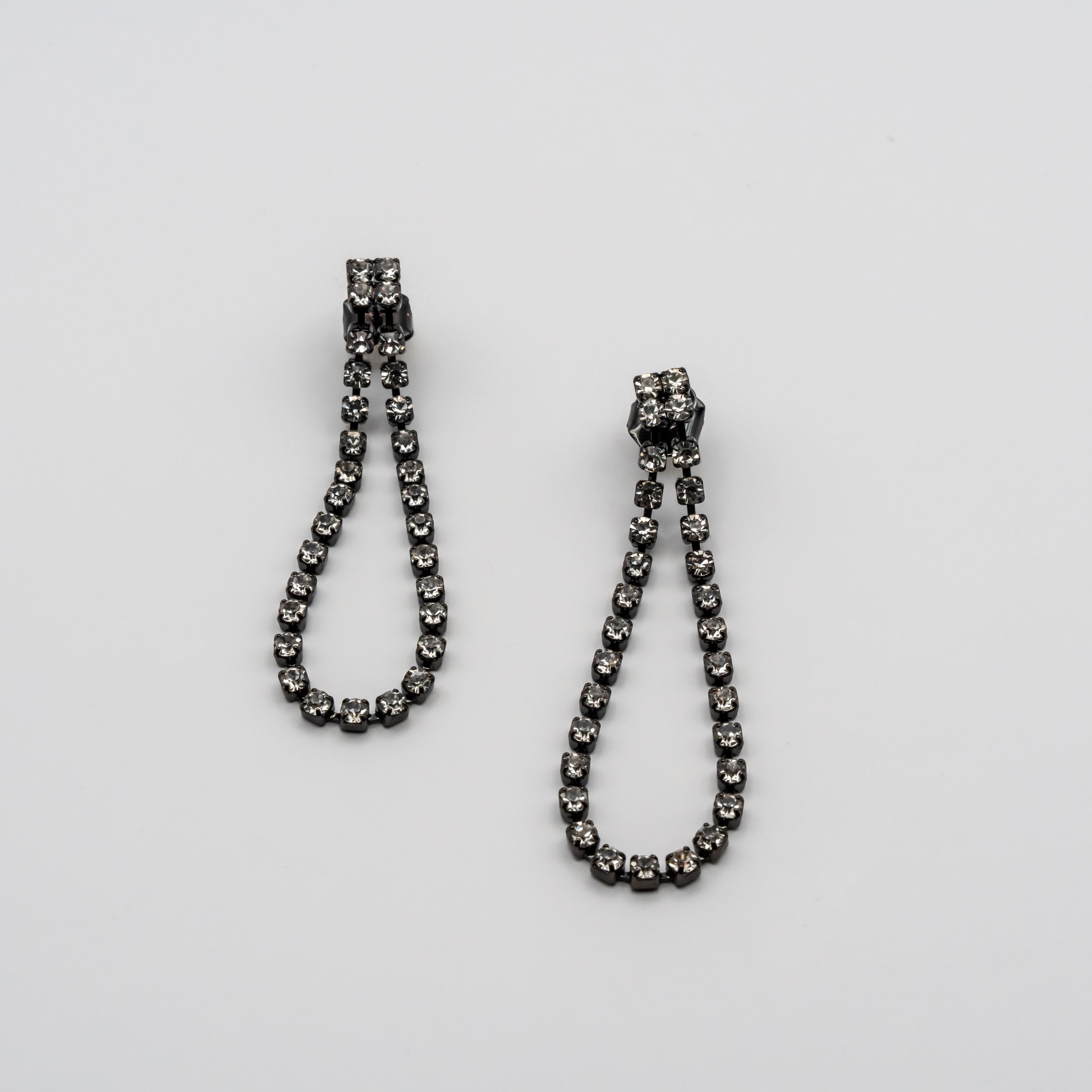 Orecchini pendenti lunghi a goccia vuota con strass luminosi su struttura nera, finitura rutenio.