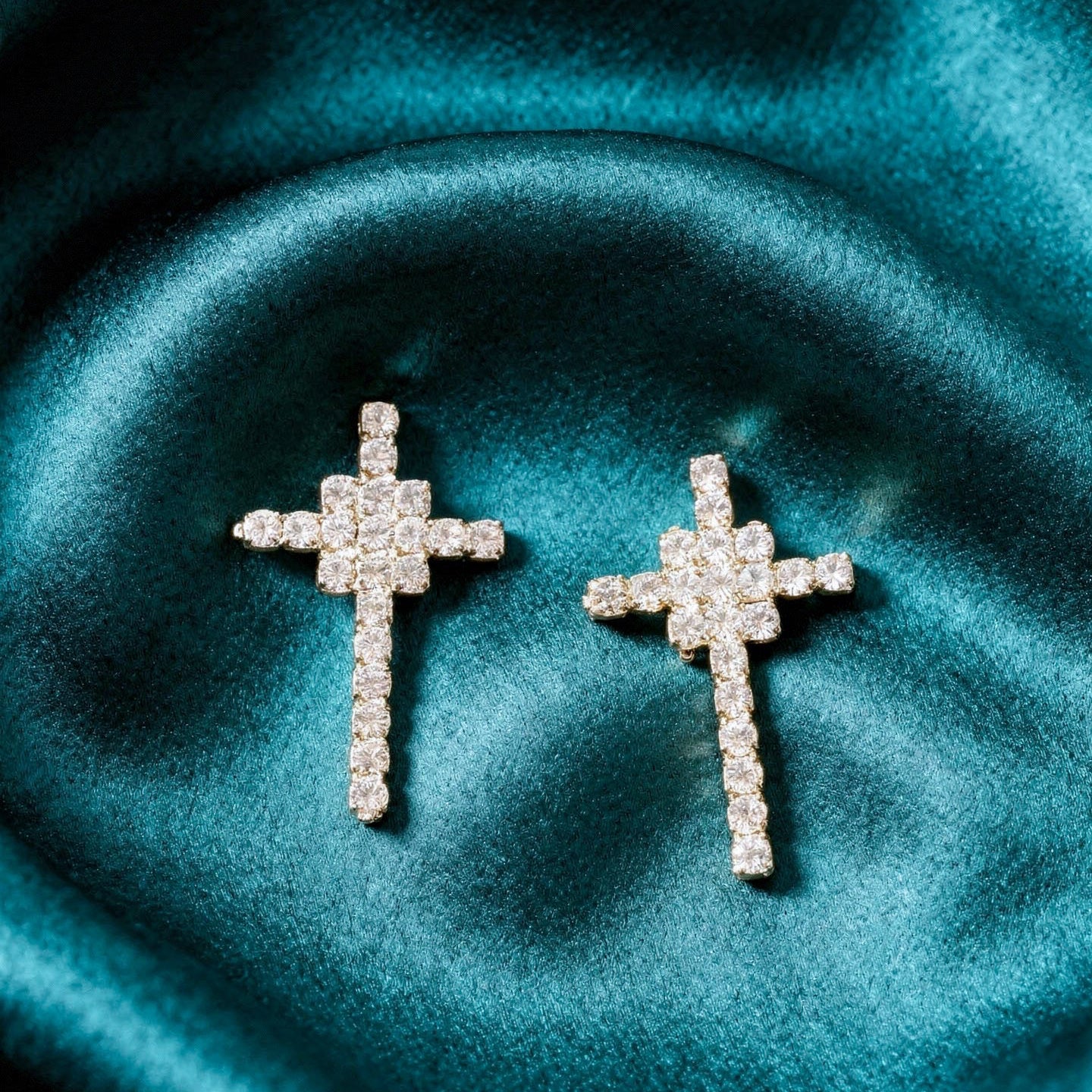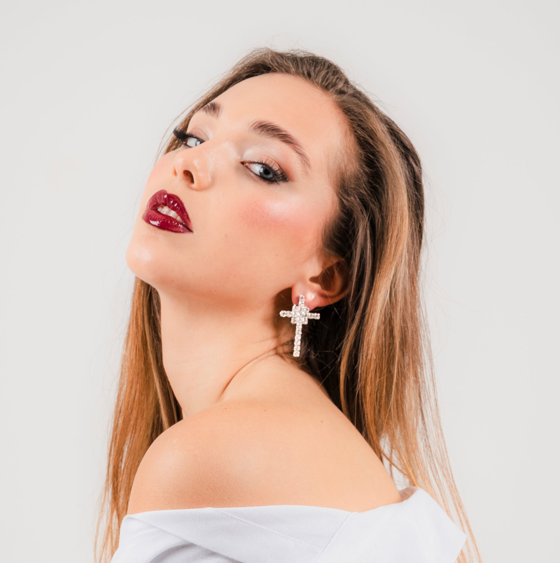 Orecchino a croce con elemento quadrato luminoso al centro. Cristalli disposti lungo tutta la struttura.