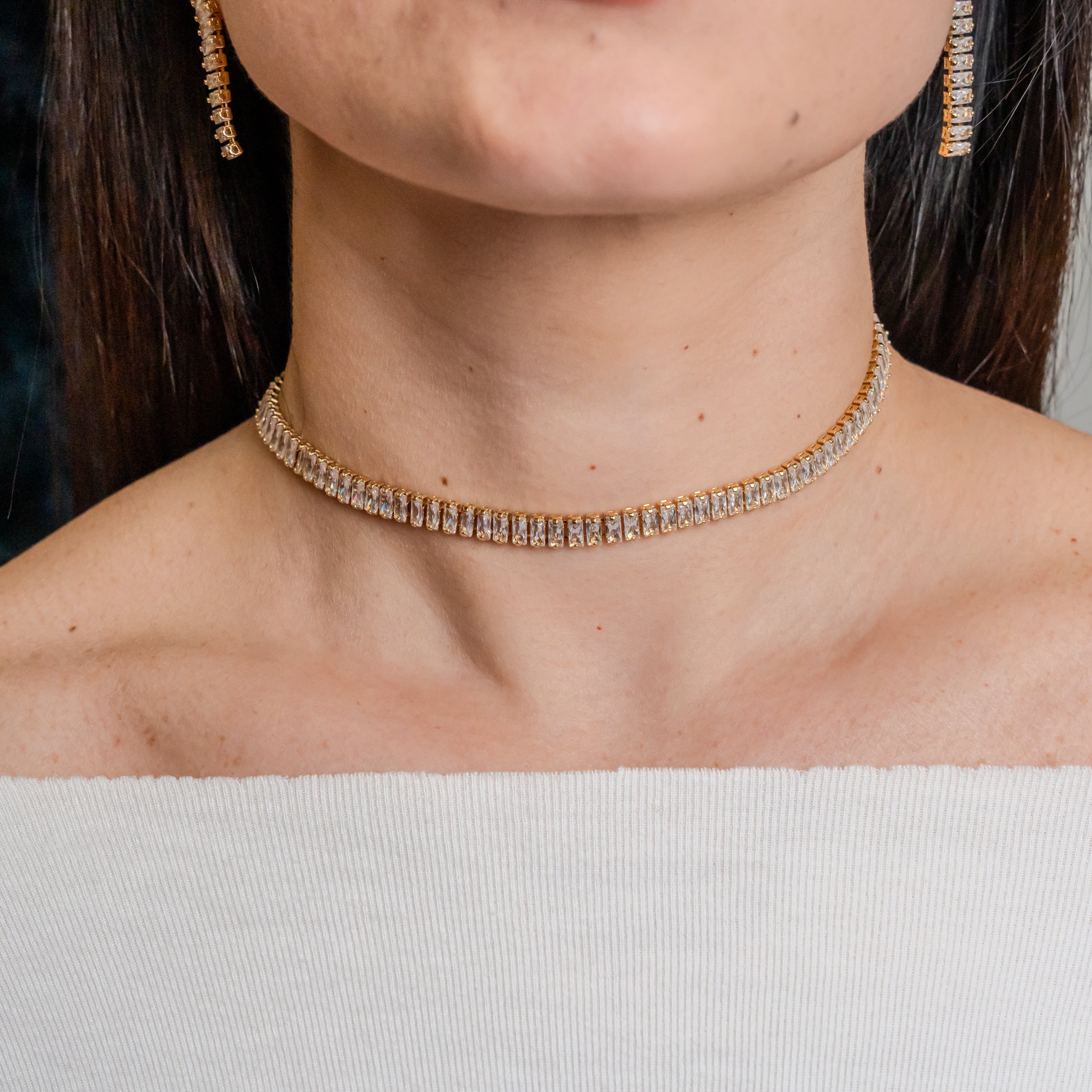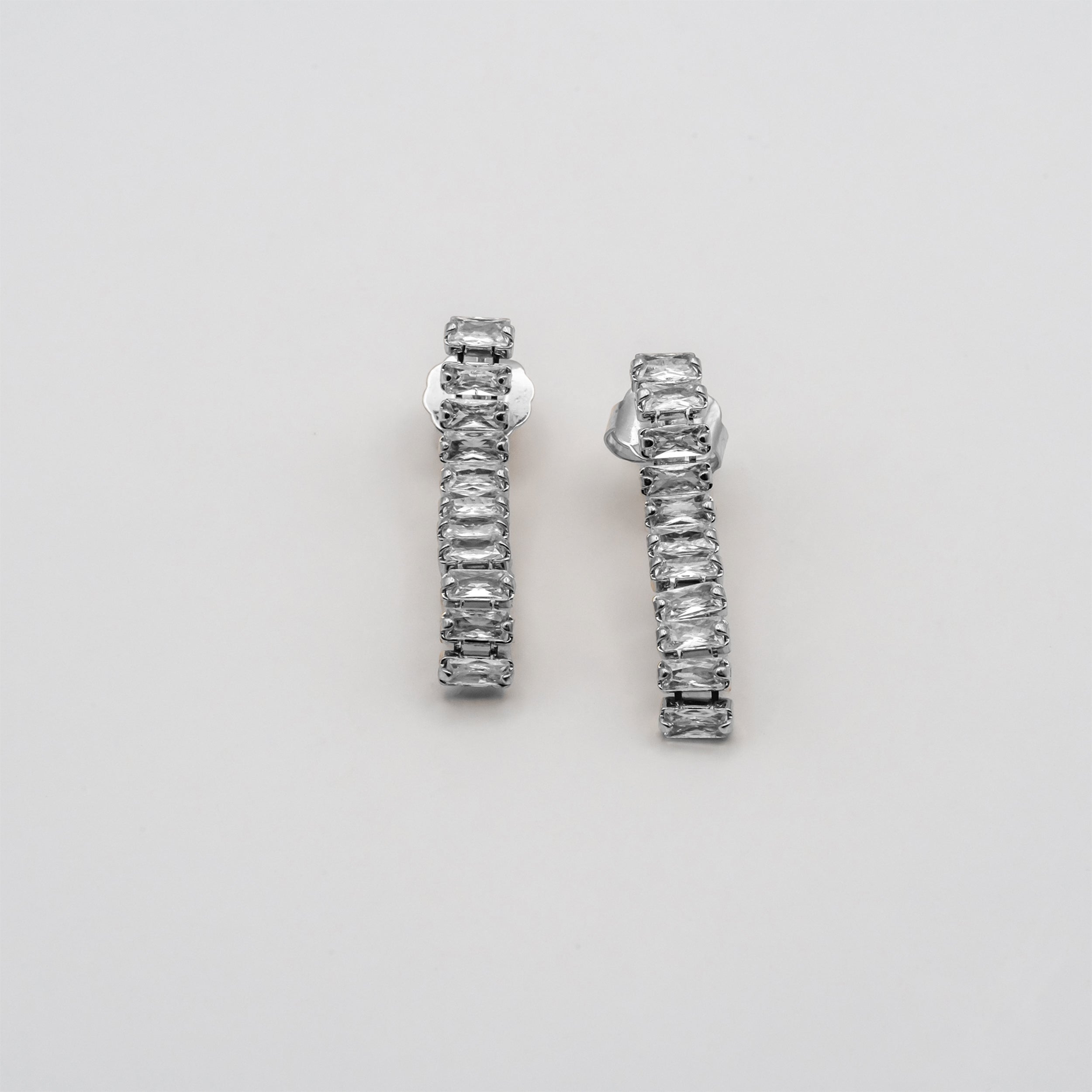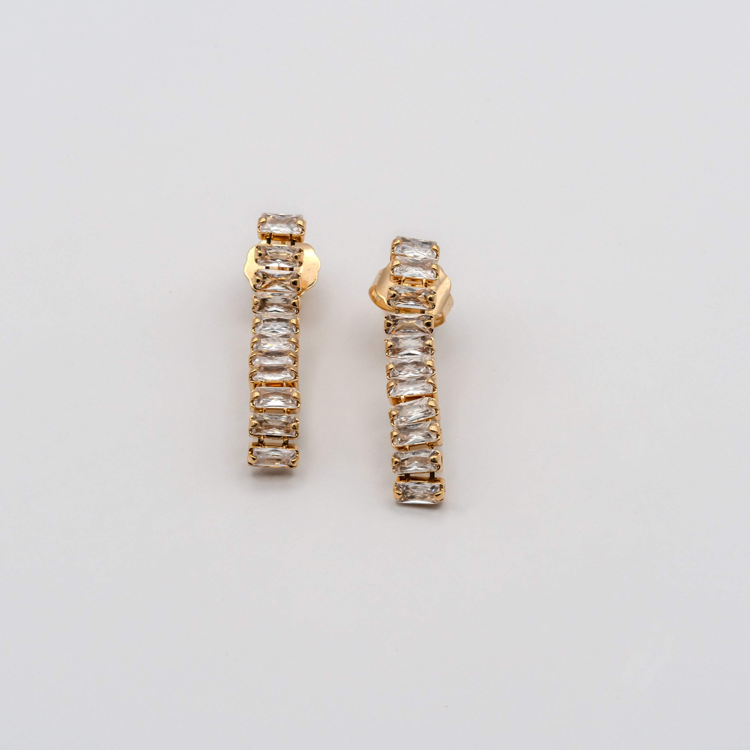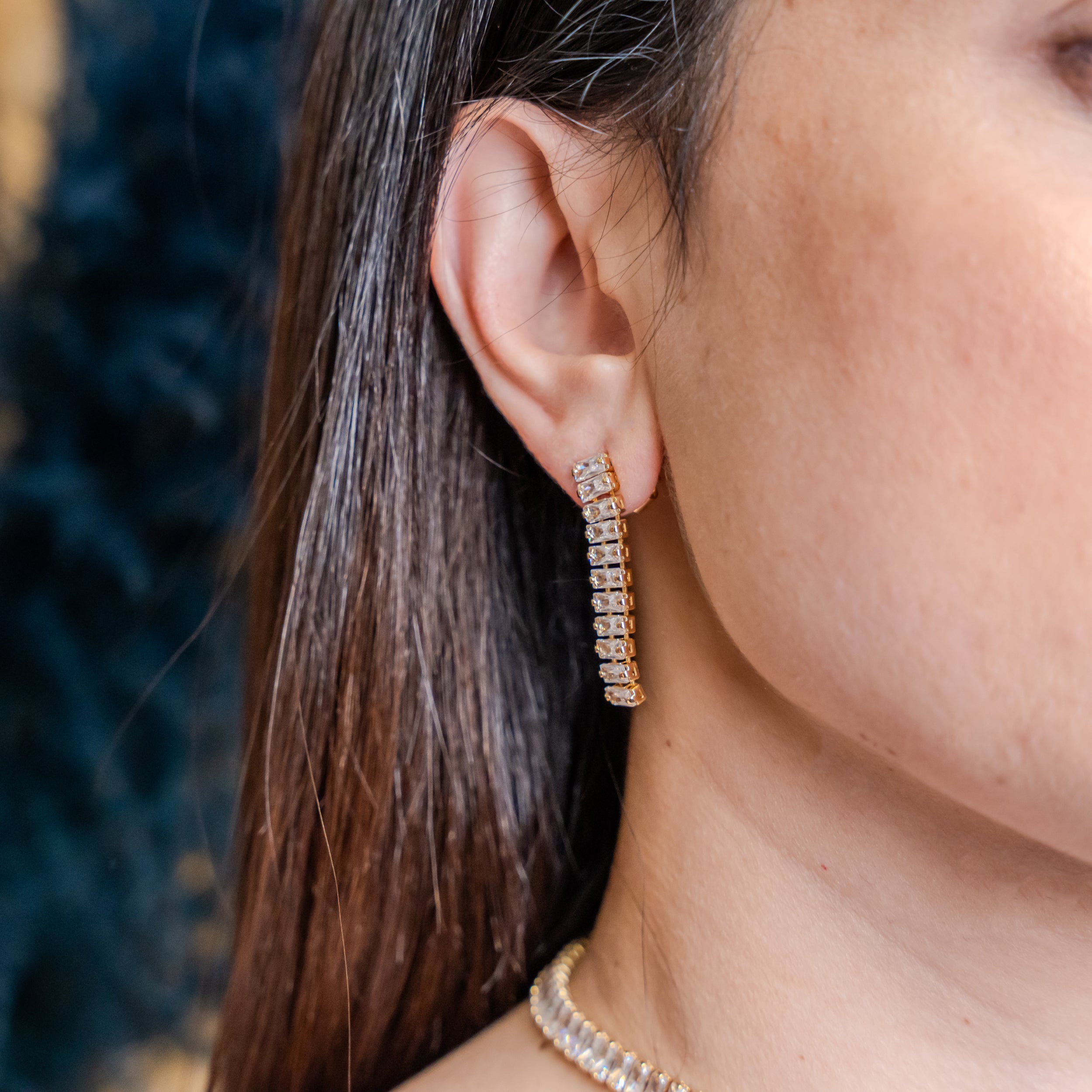 Orecchini pendenti lineari con fila verticale di strass taglio baguette, placcatura oro 18k o argento.